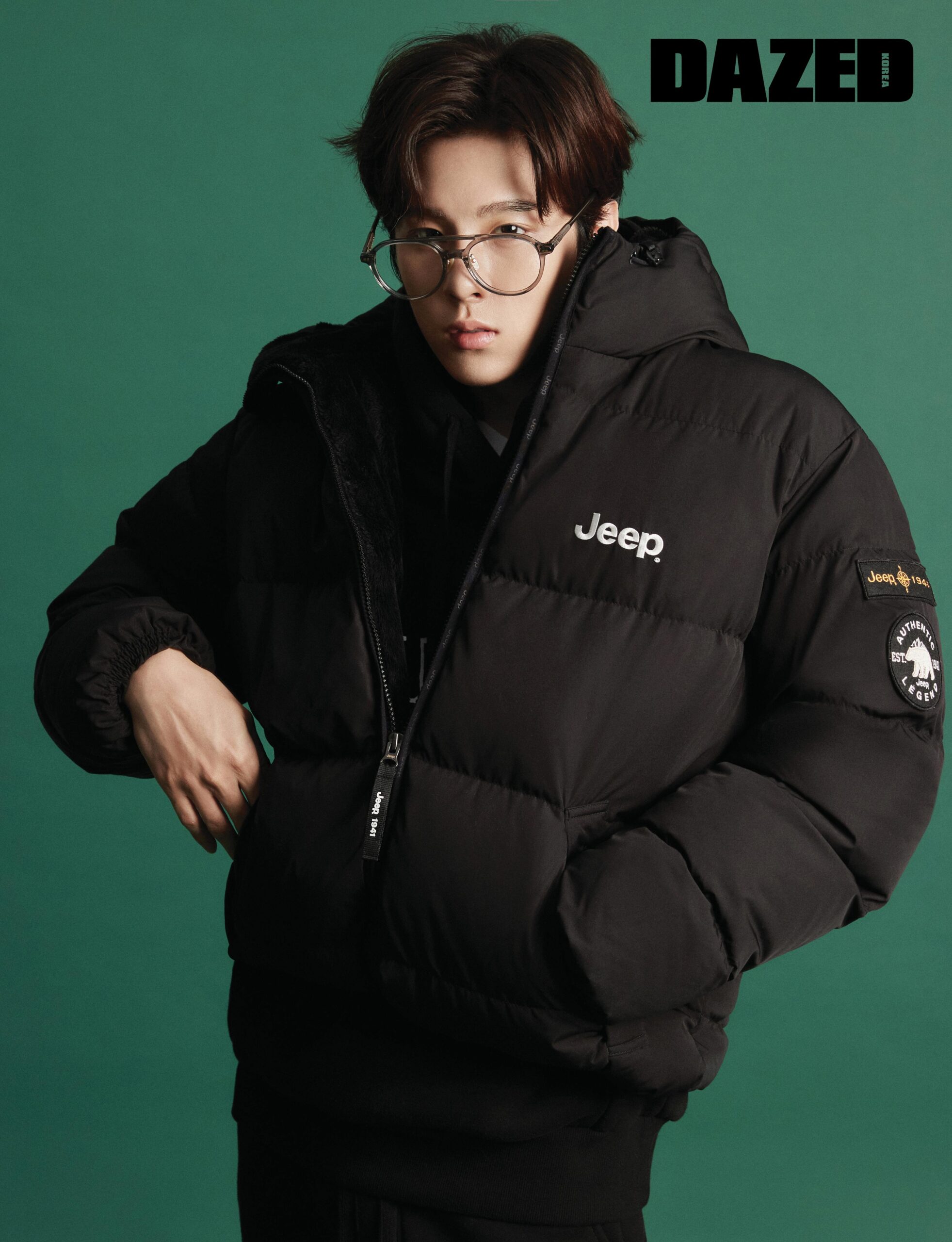 푸퍼 후드 다운점퍼와 블랙 컬러 후드 톱, 스웨트팬츠는 모두 지프(Jeep), 아이웨어는 로렌스폴(Laurence Paul).