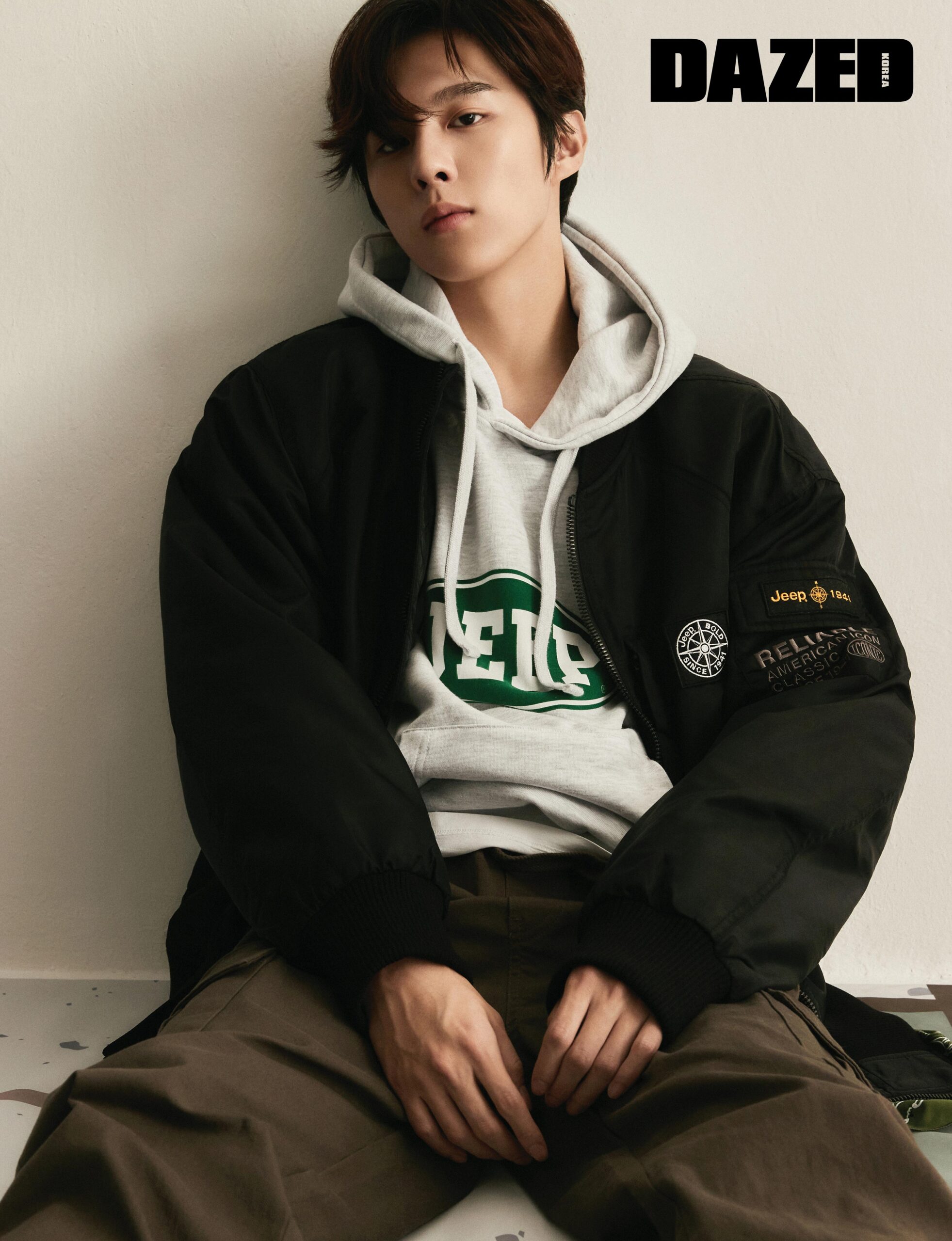 블랙 컬러의 블루종 재킷과 로고 프린트 후드 톱, 카키 컬러 카고 팬츠는 모두 지프(Jeep).