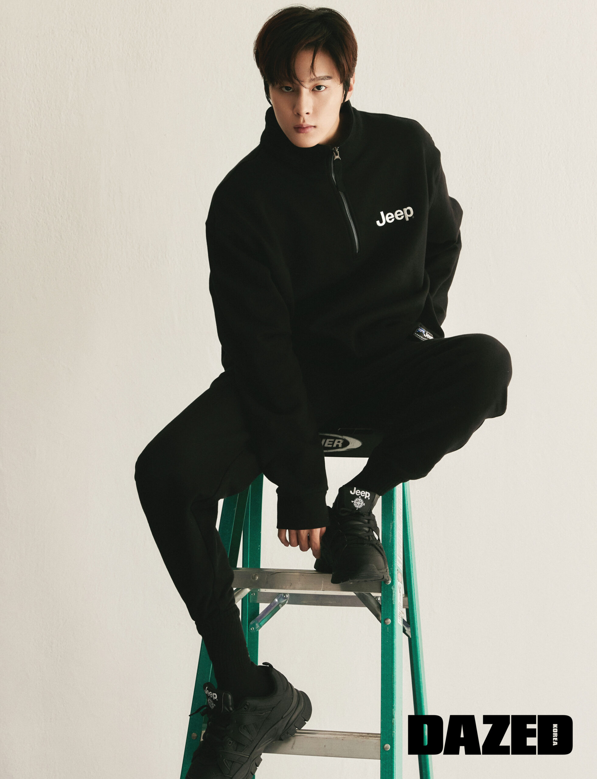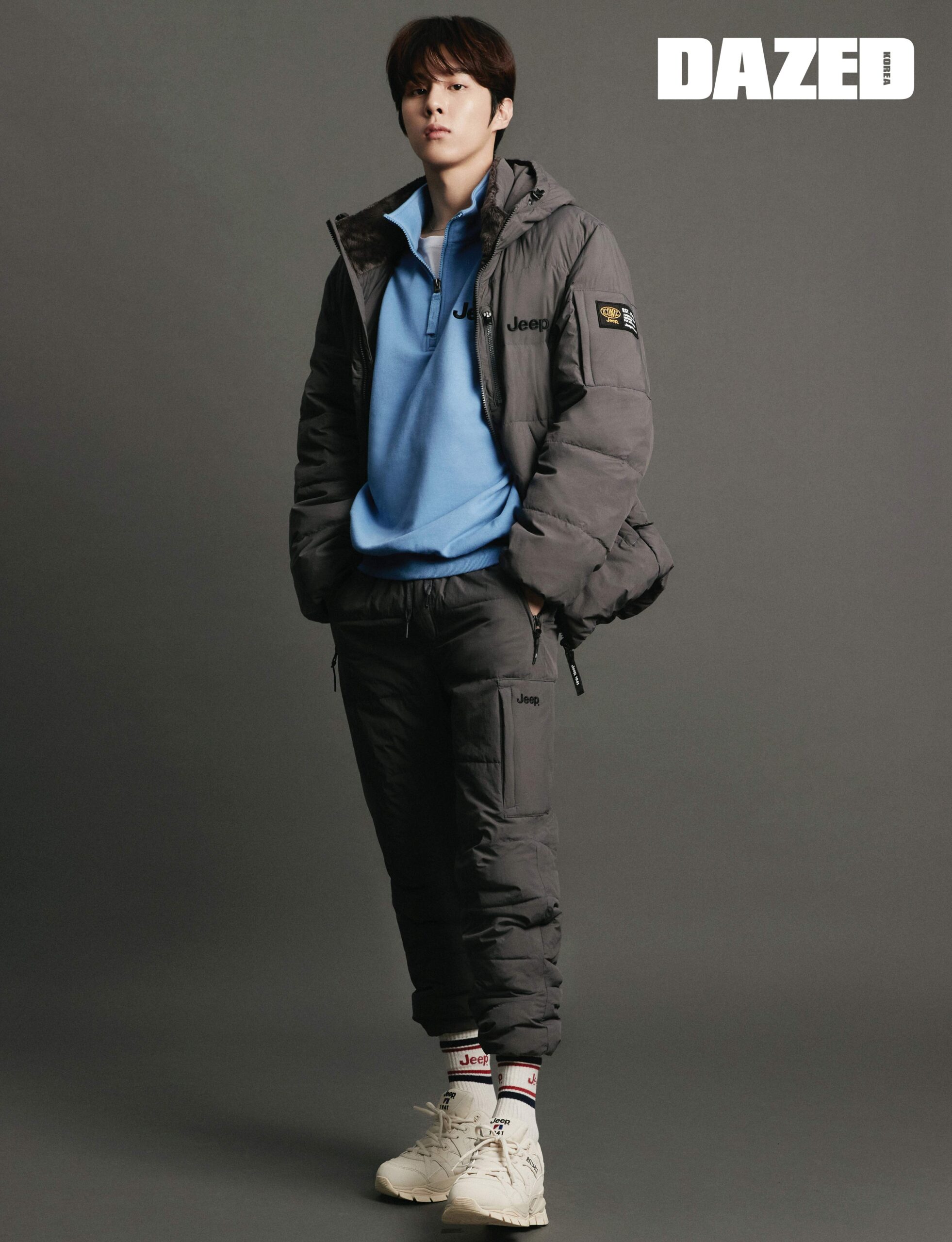그레이 컬러의 다운점퍼와 하프 집업 스웨트셔츠, 패딩 조거 팬츠, 베이지 컬러의 로고 삭스, 스니커즈는 모두 지프(Jeep). 이너로 입은 화이트 하프 슬리브 셔츠는 스타일리스트의 것.