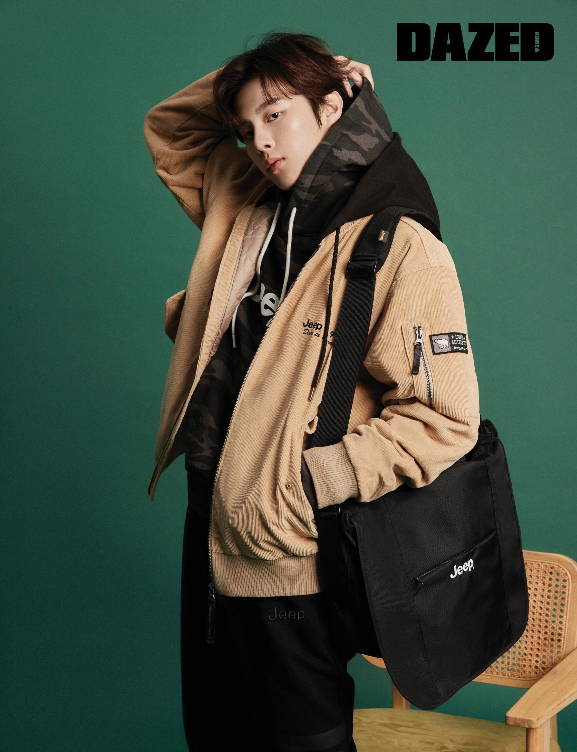 베이지 컬러의 코듀로이 MA-1 재킷과 카무플라주 패턴의 후드 톱, 블랙 스웨트팬츠, 메신저백은 모두 지프(Jeep).