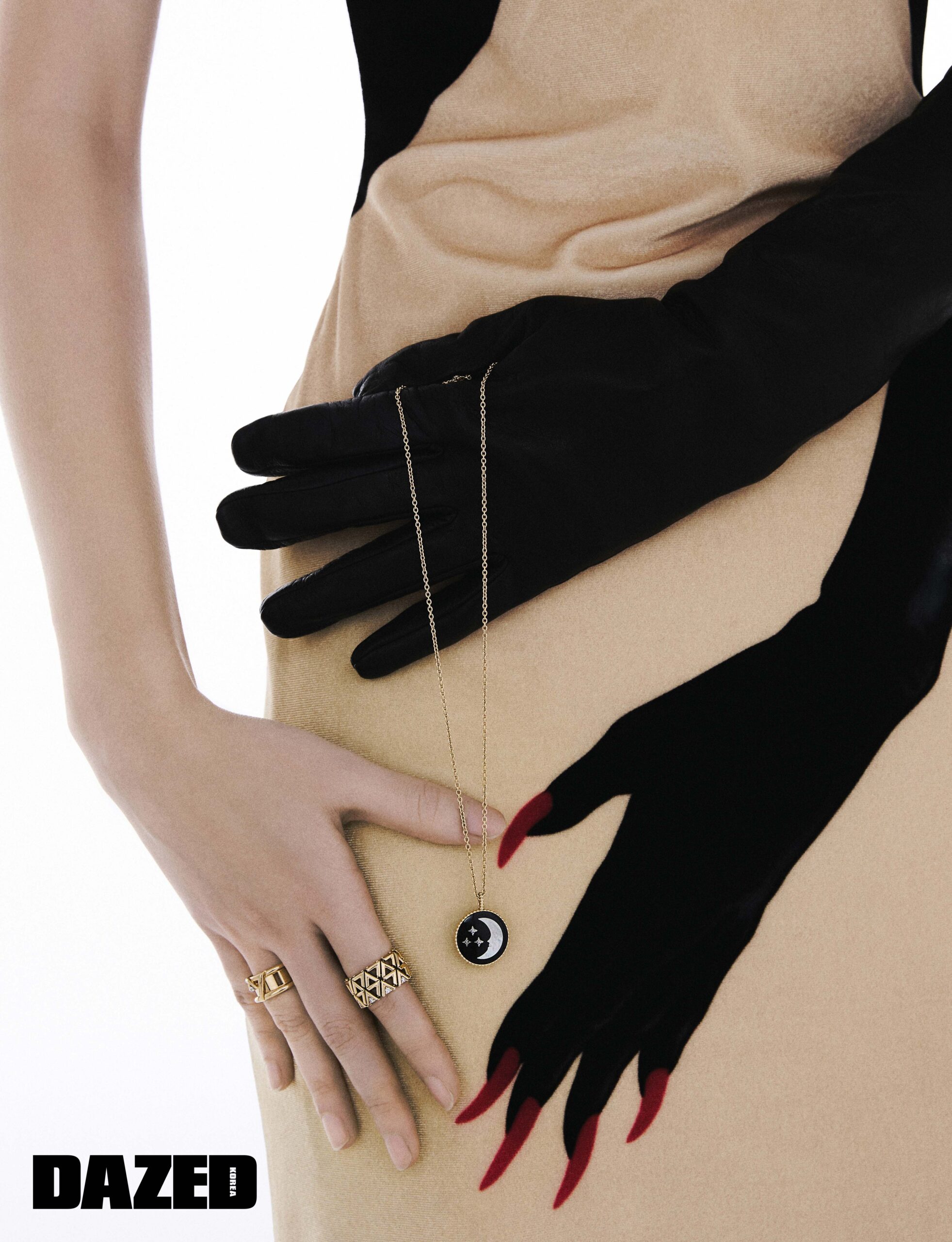 태양과 달을 펜던트의 양면에 새겨 넣은 로즈 셀레스트 네크리스는 디올 파인주얼리(Dior Joaillevie), 브랜드를 상징하는 알파벳을 건축적으로 쌓아 올린 메시 스타일의 LV 볼트 링과 에너지와 리듬에서 영감받은 LV 볼트 밴드 링은 루이 비통(Louis Vuitton), 초현실적 프린트가 인상적인 드레스는 로에베(Loewe).