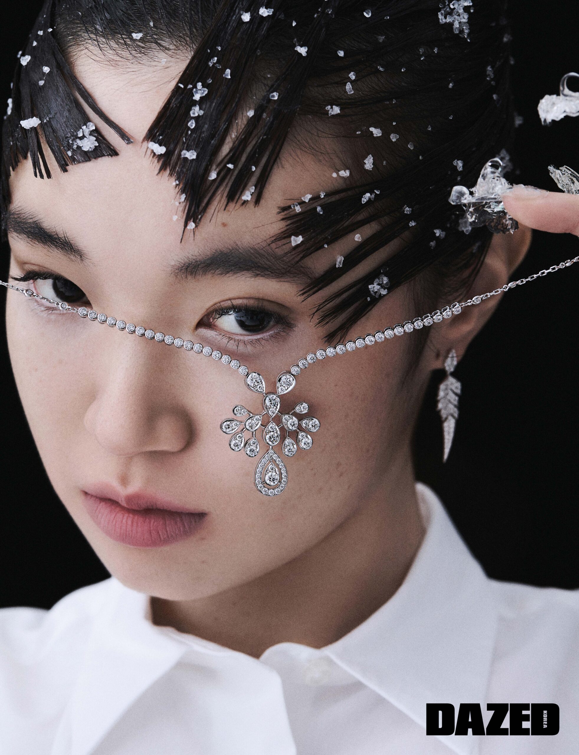 조세핀 황후의 아름다움을 찬미한 조세핀 아그레뜨 임페리얼 펜던트 네크리스는 쇼메(Chaumet), 야생 피센트의 무지갯빛 깃털을 다이아몬드의 화려함으로 묘사한 마그니피센트 파베 쇼트 이어링은 스티븐 웹스터(Stephen Webster), 화이트 셔츠는 악셀 아리가토(Axel Arigato).