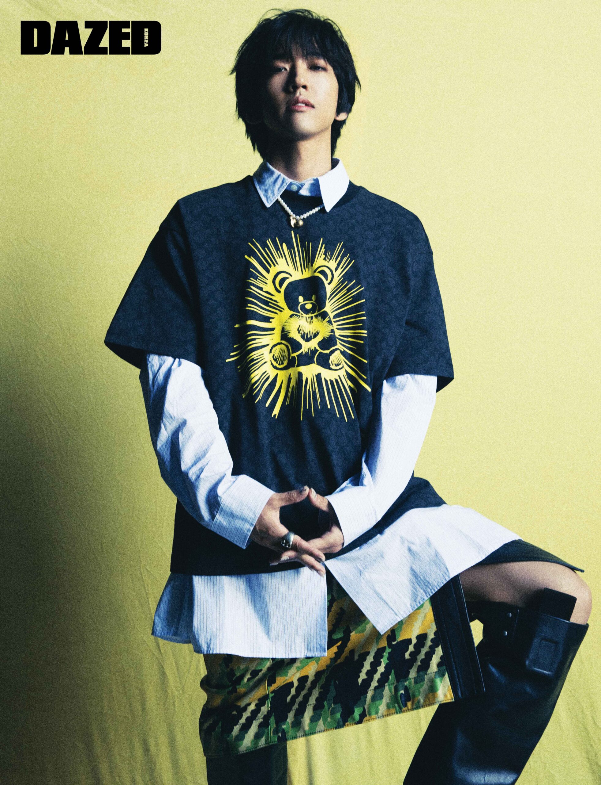 프린트 톱은 코치(Coach), 이너로 레이어링한 셔츠는 디올 맨(Dior Men), 링은 크롬하츠(Chrome Hearts).