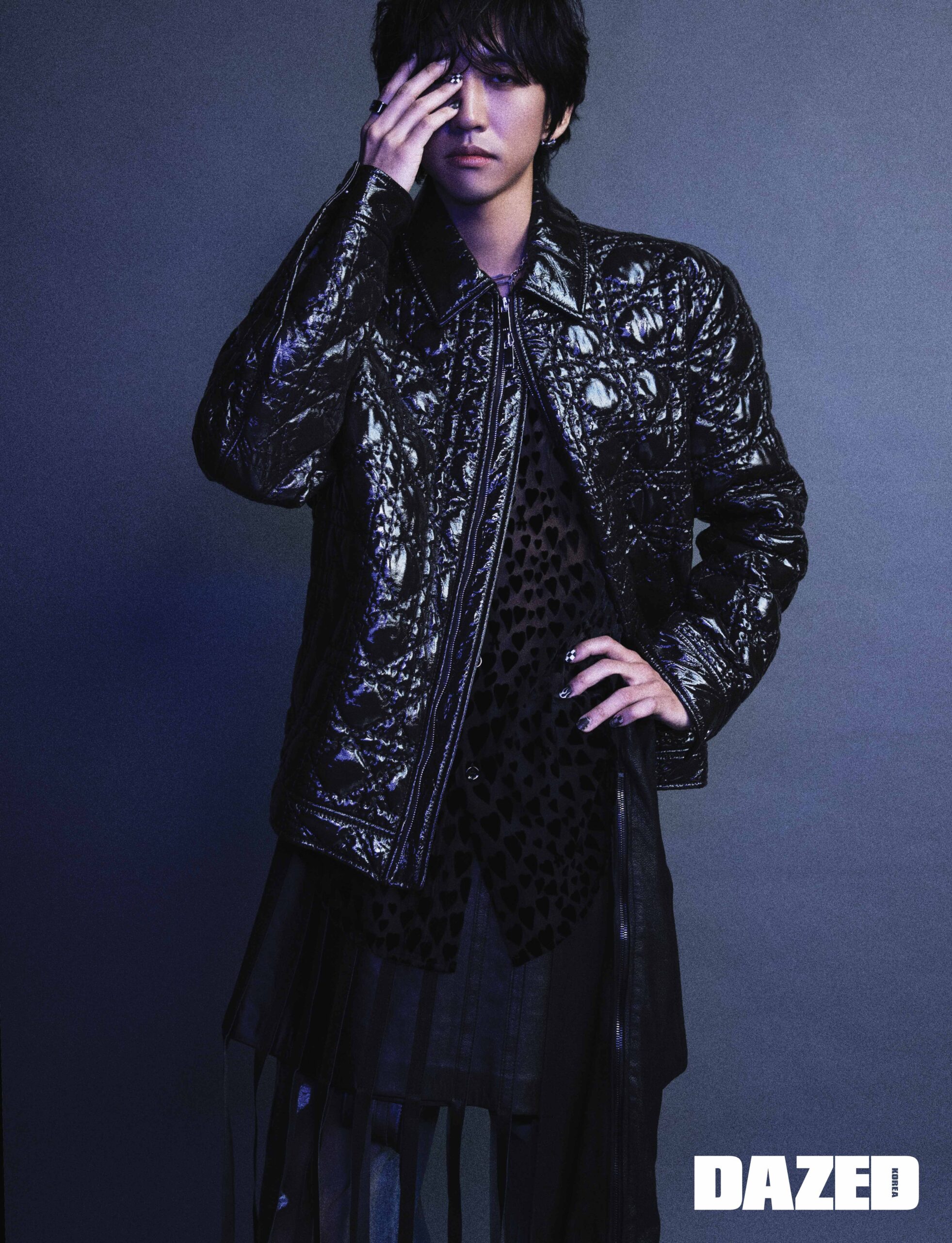 퀼팅 패턴 재킷은 디올 맨(Dior Men), 하트 패턴의 시스루 셔츠는 아미(Ami), 이너로 레이어링한 프린지 디테일 드레스는 느와르라르메스(Noir Larmes), 데님 팬츠는 아더에러(Ader), 이어링은 크롬하츠(Chrome Hearts), 클립 장식의 체인 네크리스는 오프화이트(Off-White™), 링은 돌체앤가바나(Dolce&Gabbana).