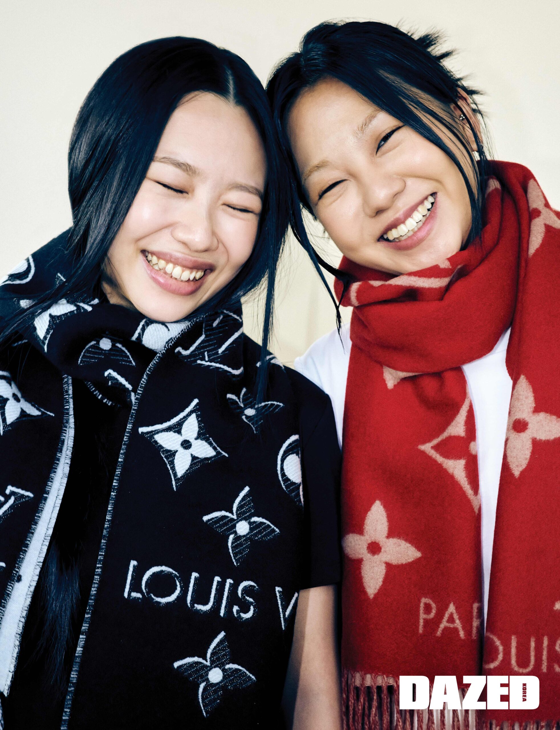에바가 착용한 티셔츠와 헤어핀, 플레이그램 퍼 스카프는 모두 루이 비통(Louis Vuitton). 다영이 착용한 티셔츠와 루이즈 후프 이어링, 고그램 퍼 스카프는 모두 루이 비통(Louis Vuitton).