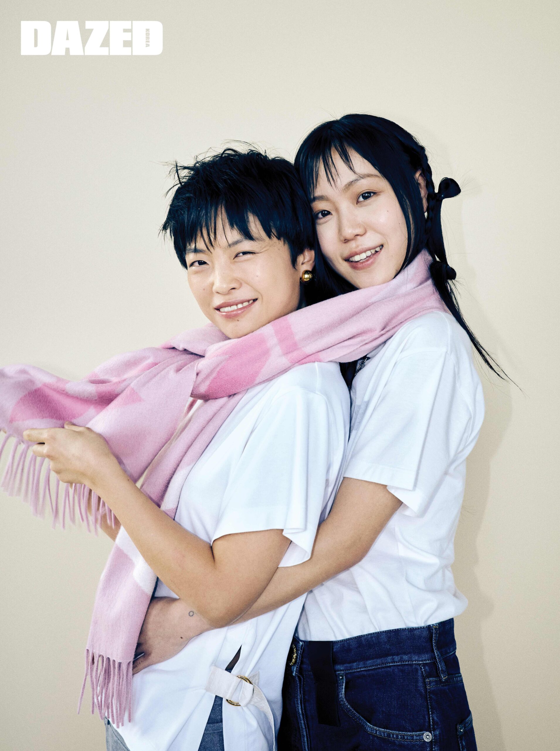 휘가 착용한 사이드 스트랩 티셔츠와 LV 플래닛 이어링은 루이 비통(Louis Vuitton), 팬츠는 휘의 것. 토이카가 착용한 LV 티셔츠와 데님 팬츠는 루이 비통(Louis Vuitton). 디 얼티밋 스카프는 루이 비통(Louis Vuitton).