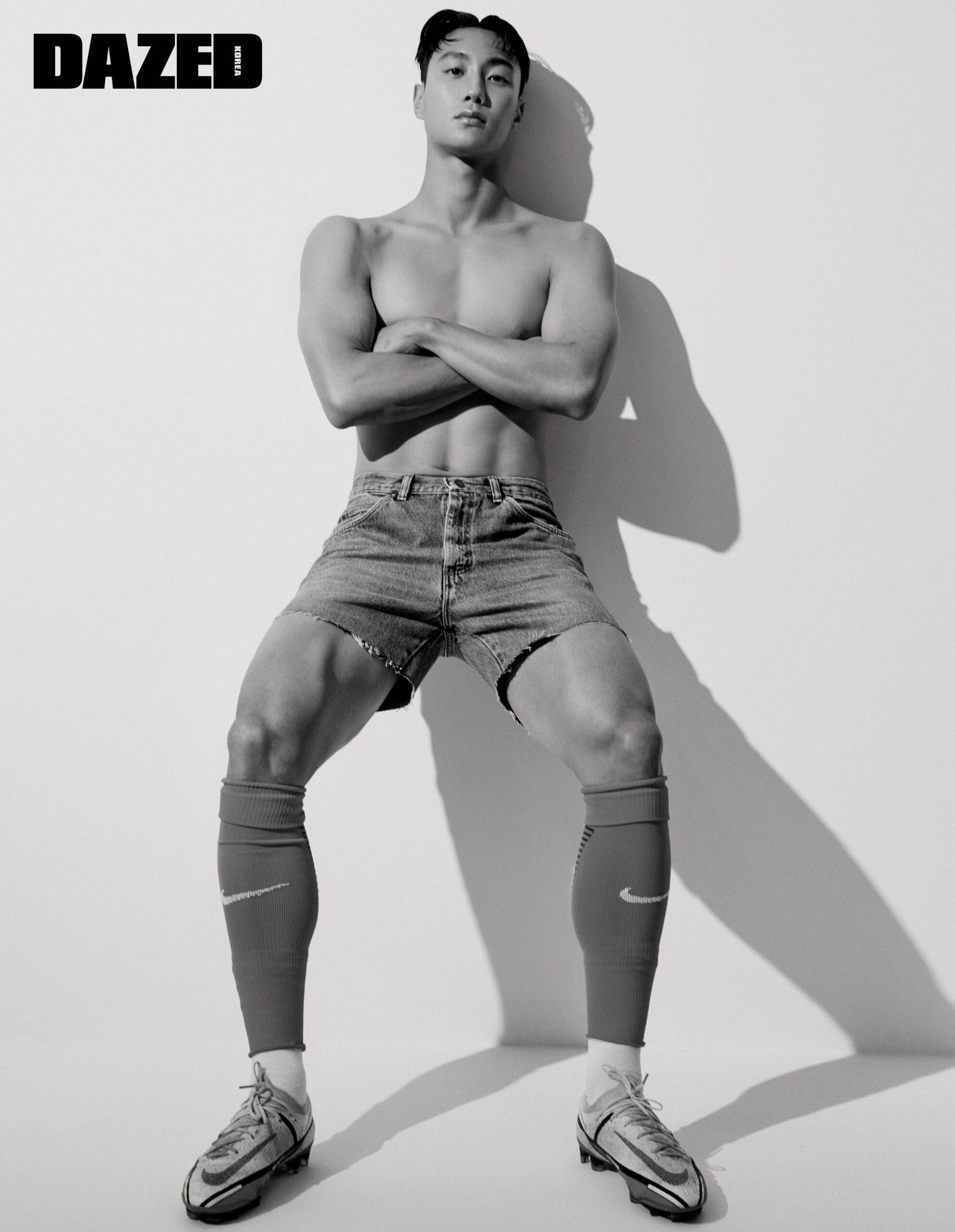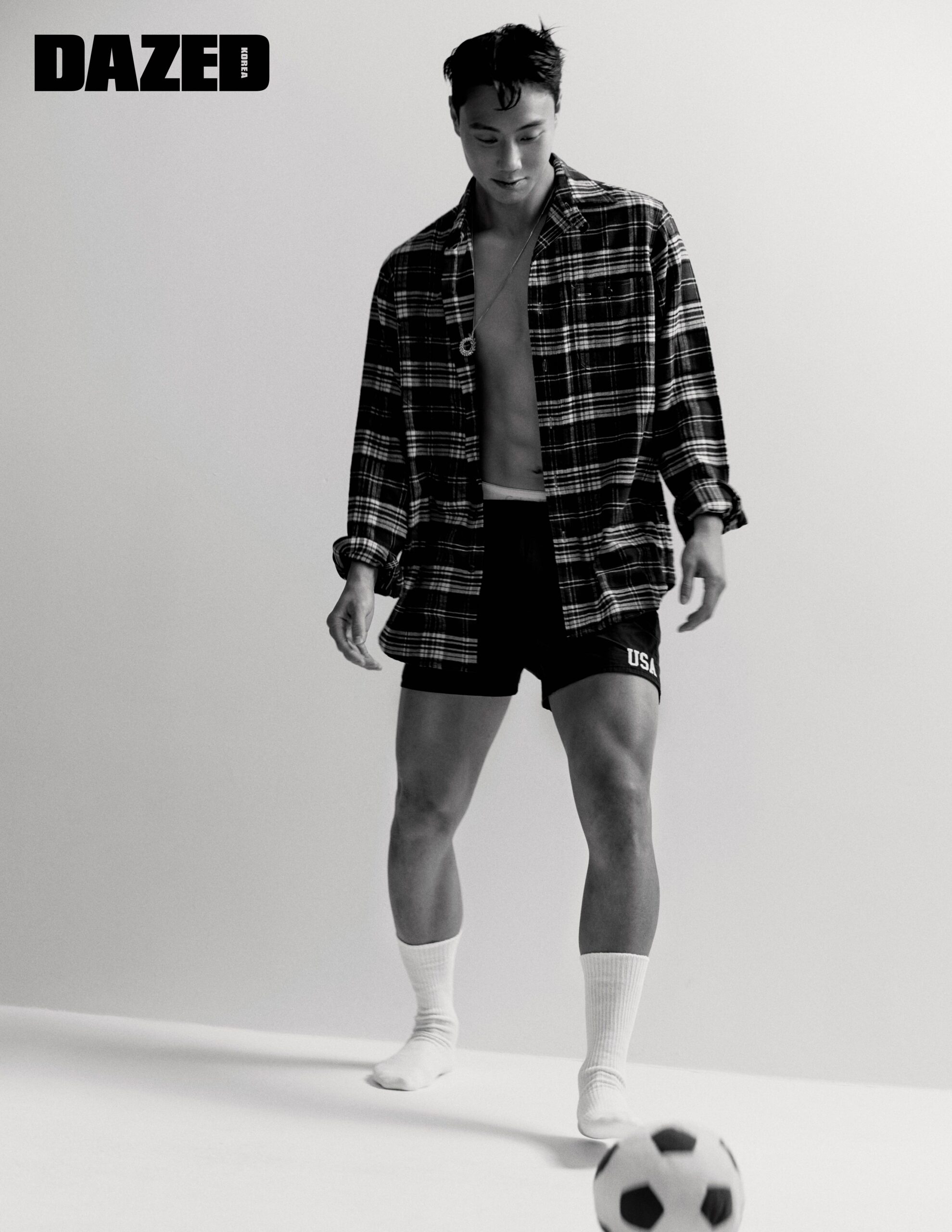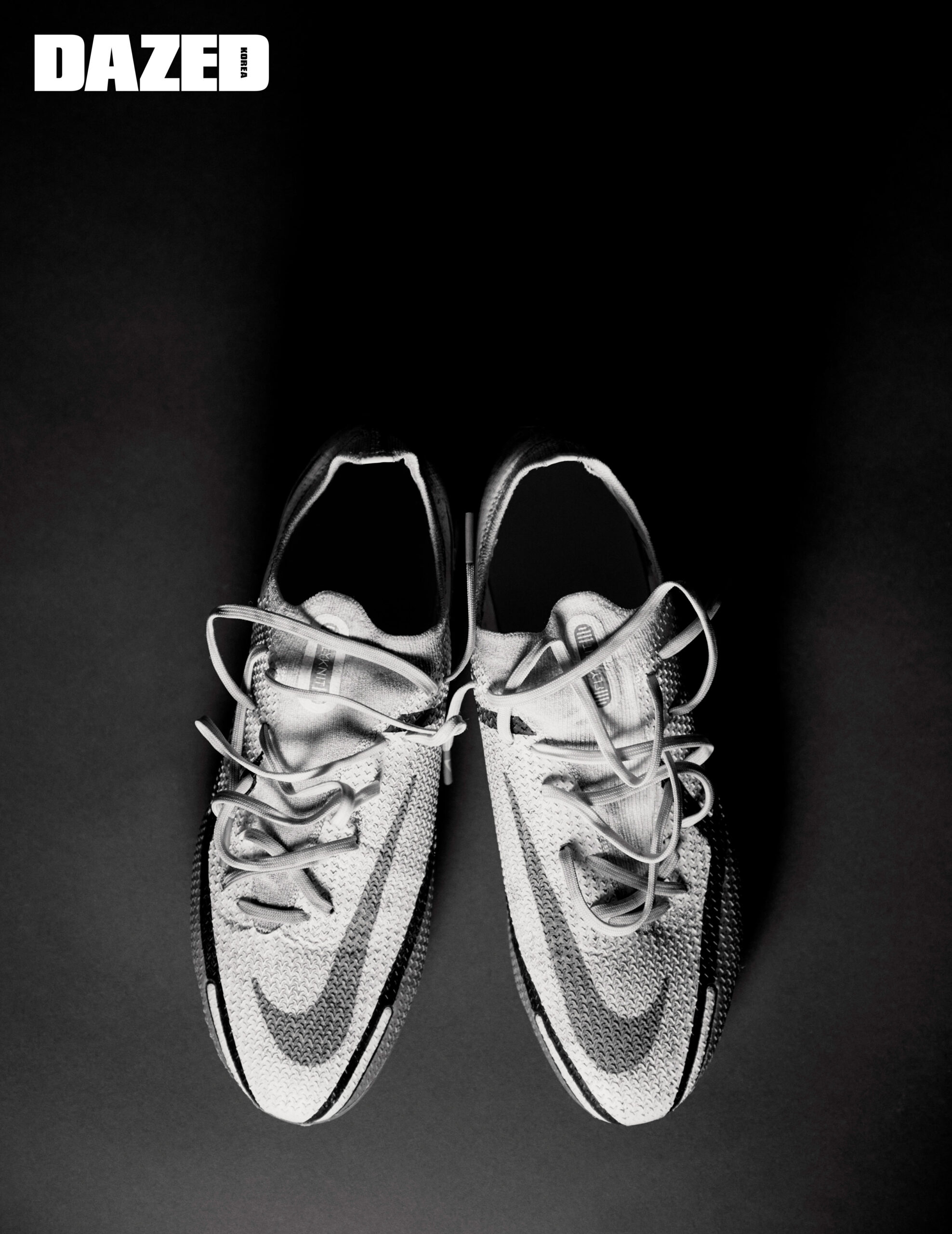 스트라이프 셔츠와 팬츠 셋업은 보테가 베네타(Bottega Veneta), 축구화는 승호의 것.