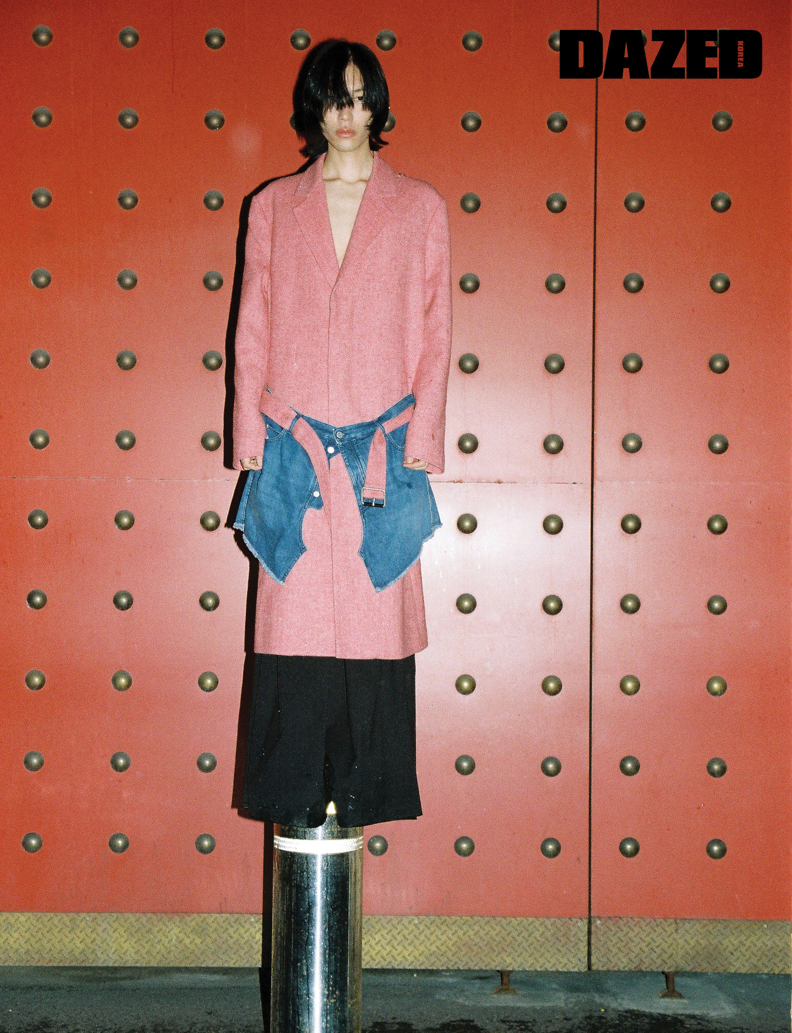 데님 레이어드 핑크 코트는 로에베(Loewe), 블랙 와이드 팬츠는 시도즈(Xidozu).