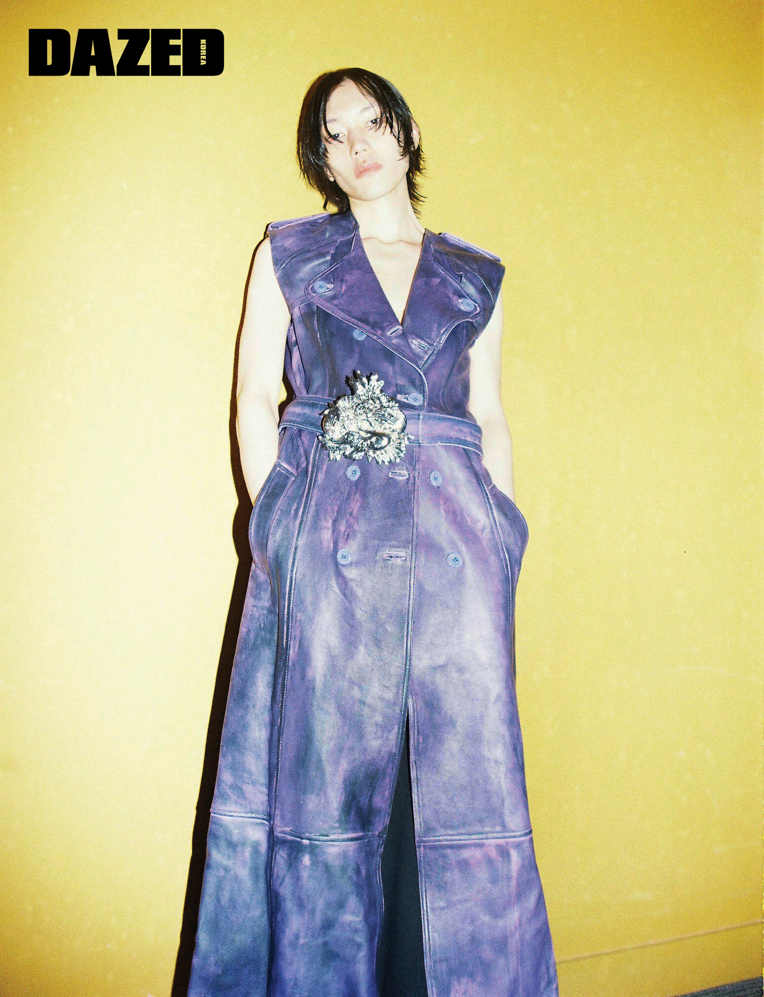 버클 장식이 돋보이는 퍼플 레더 슬리브리스 코트는 아크네 스튜디오(Acne Studios), 블랙 스커트는 포스트 아카이브 팩션(PAF).
