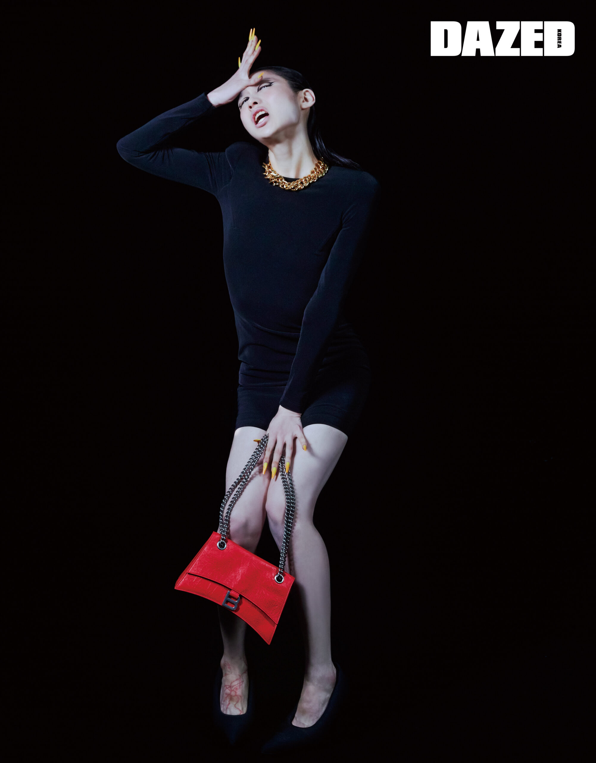 블랙 미니드레스와 펌프스 힐, 골드 체인 네크리스, 레드 컬러 체인 백은 모두 발렌시아가(Balenciaga).