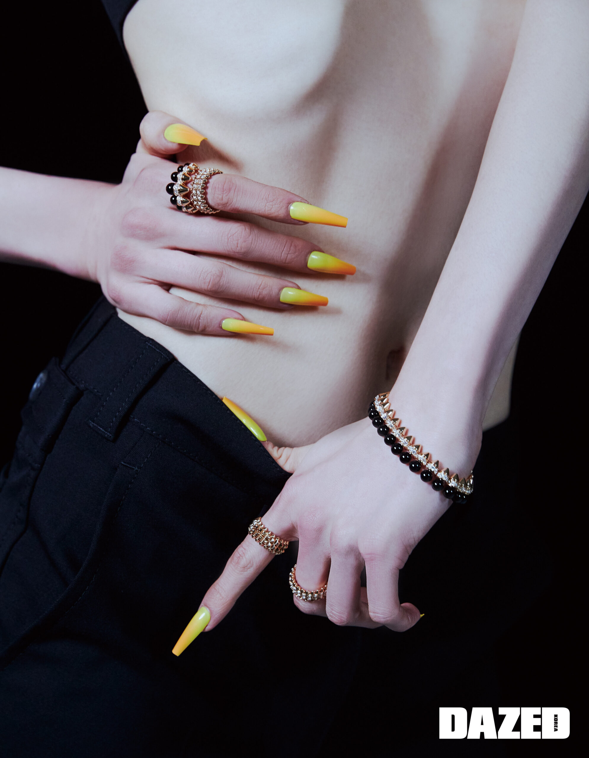 블랙 팬츠는 미우미우(Miu Miu), 더블 로우 다이아 링과 링으로 연출한 오닉스 이어링, 더블 로우 링, 오닉스 플렉시블 브레이슬릿은 모두 까르띠에(Cartier).
