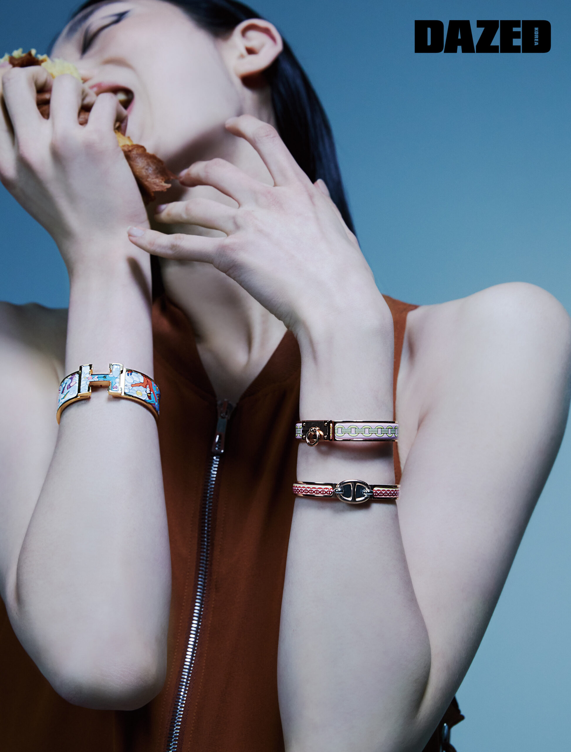슬리브리스 점프슈트와 에나멜 소재의 브레이슬릿, 울트라 핑크 컬러 브레이슬릿, 링 디테일 브레이슬릿은 모두 에르메스(Hermès).