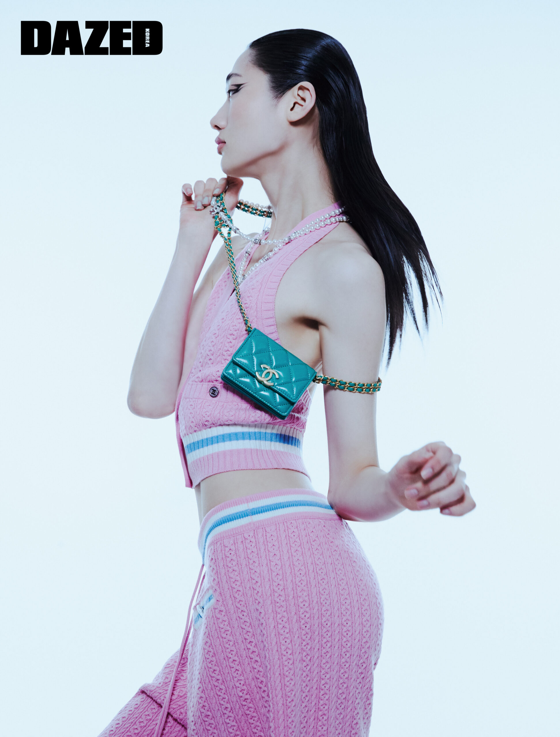 핑크 컬러 니트 베스트와 버뮤다 쇼츠, 펄 로고 롱 네크리스, 로고 스트랩이 특징인 클러치백은 모두 샤넬(Chanel).