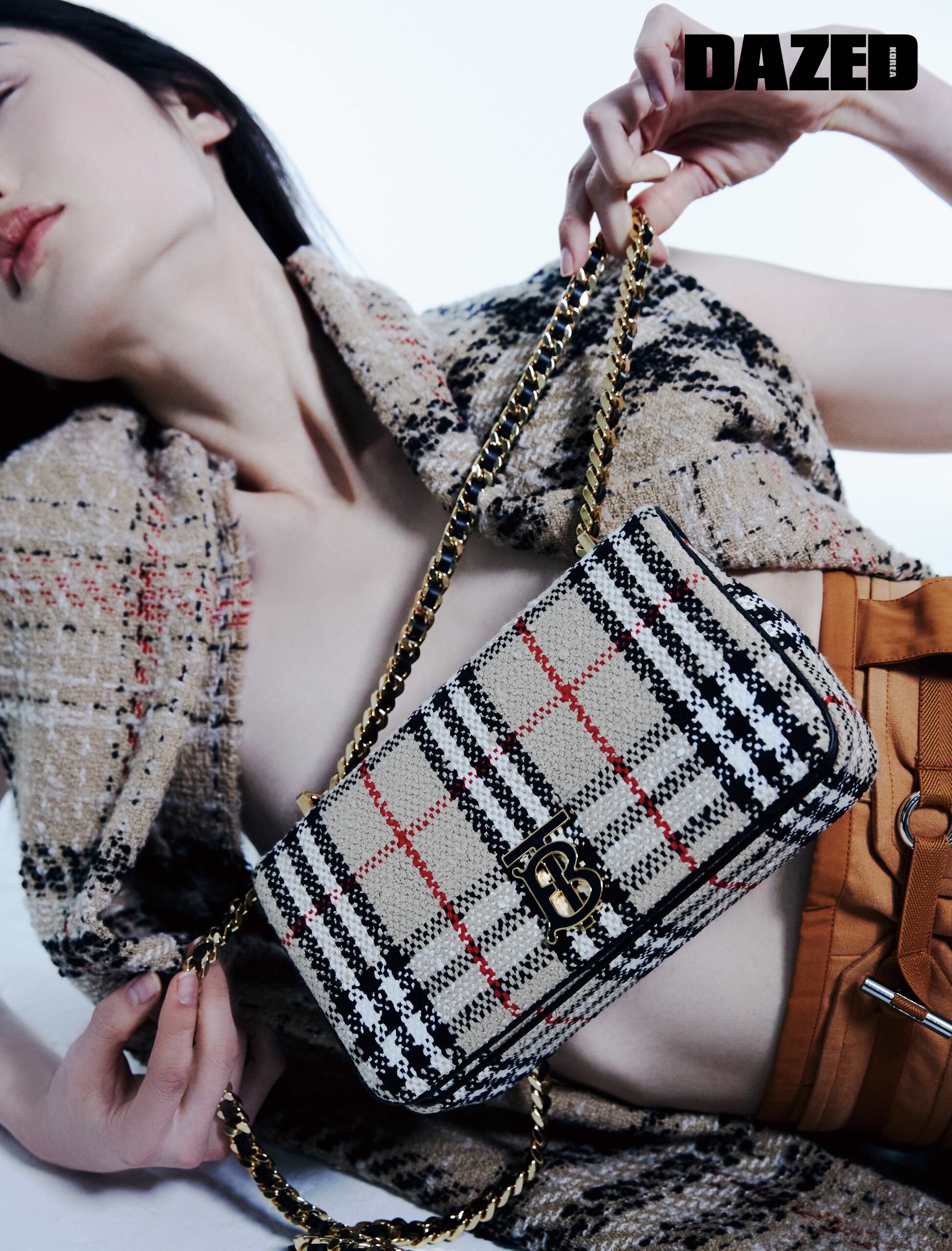 톱으로 연출한 머플러와 빈티지 체크 부클레 롤라 백은 버버리(Burberry), 웨이스트 벨트가 특징인 쇼츠는 에르메스(Hermès).