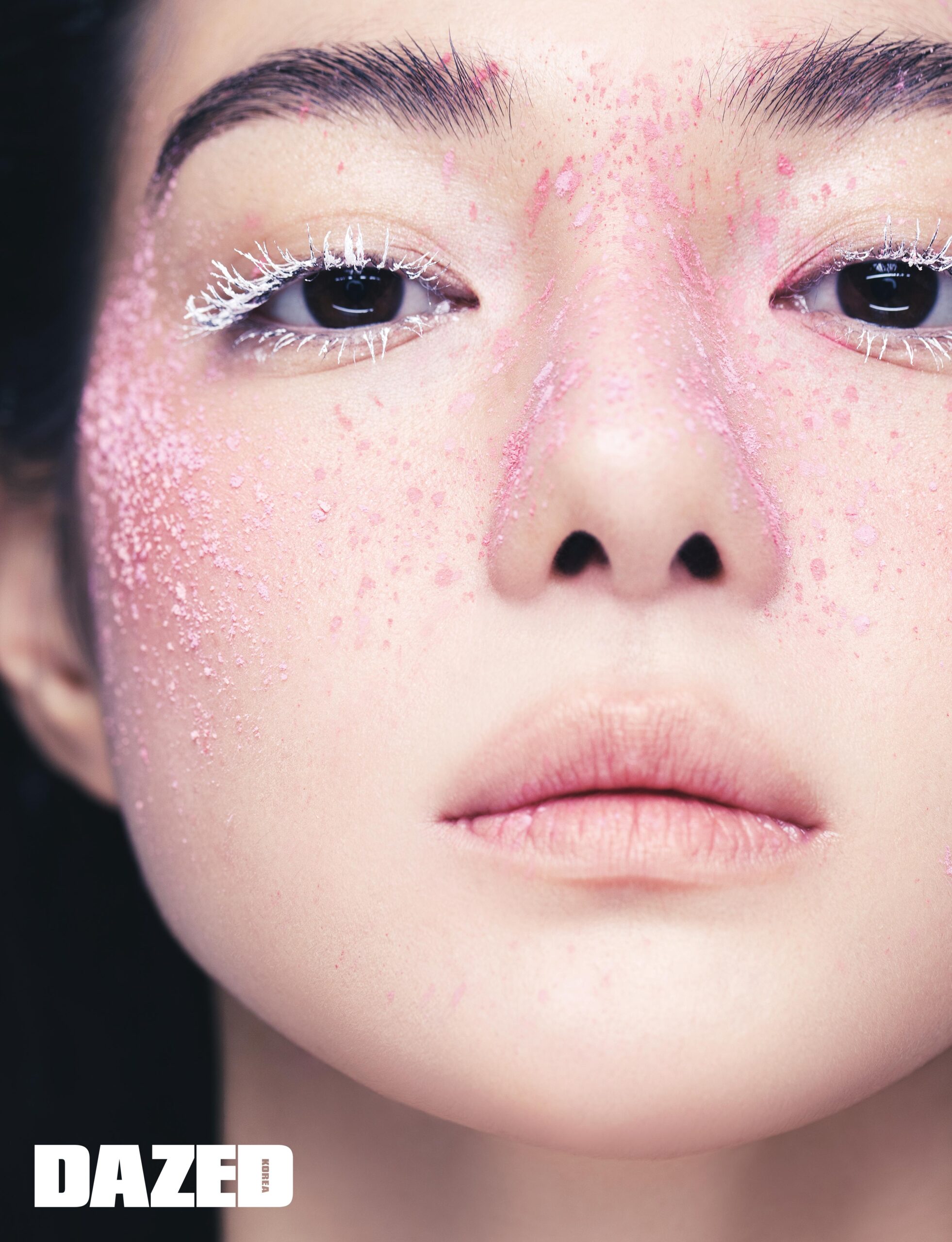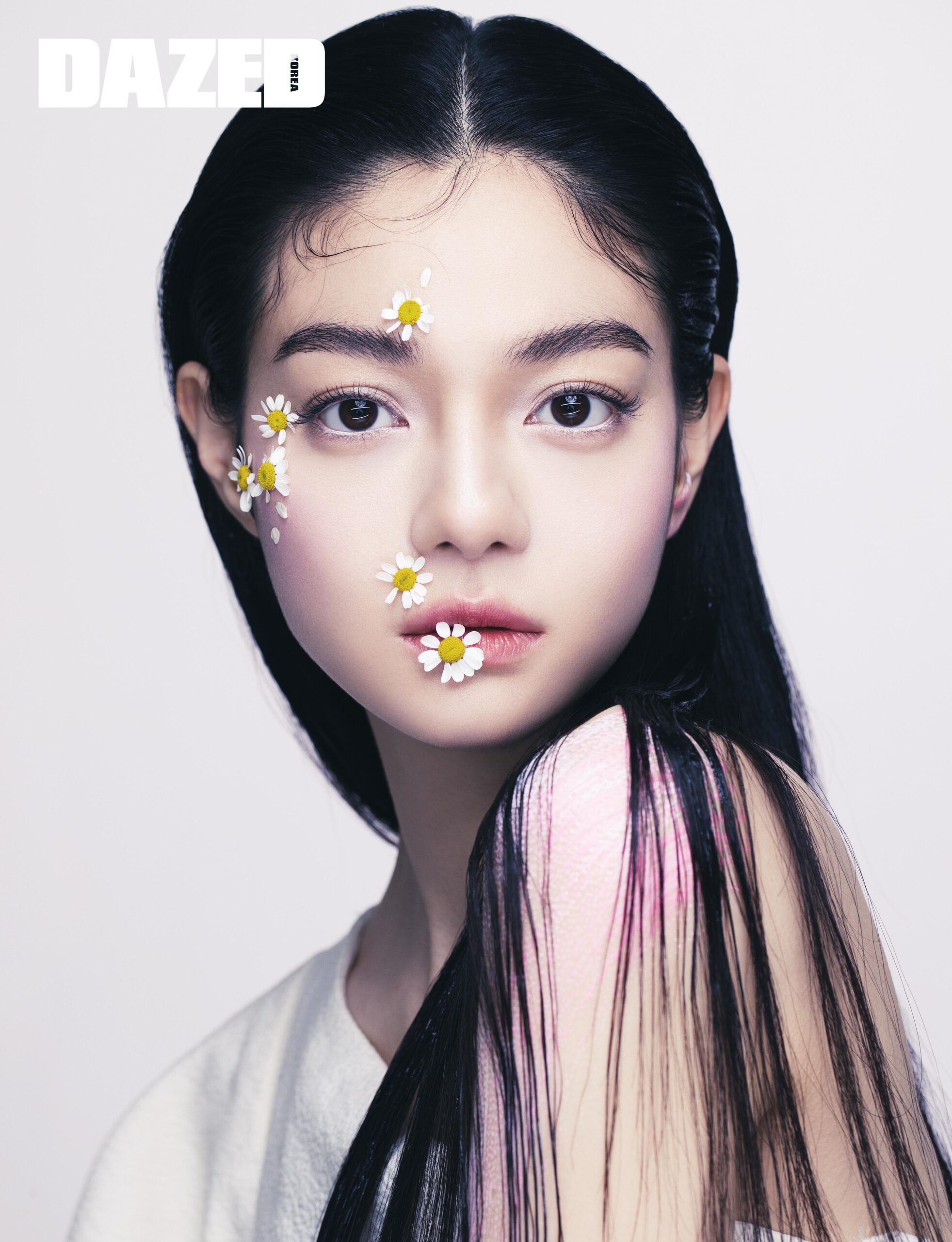 디올 포에버 24H 웨어 하이 퍼펙션 파운데이션을 브러시로 얇게 펴 바른 뒤 모노 꿀뢰르 꾸뛰르 006 펄스타를 눈머리와 눈두덩에 바른다. 디올쇼 스테이지 라이너 001 매트 화이트로 아래 점막을 메우고 디올 백스테이지 로지 글로우 001 핑크를 양 볼에 발라 혈색을 더한다. 입술에는 디올 어딕트 글로우 001 핑크를 베이스로 넓게 바른 뒤 입술 안쪽에 031 스트로베리를 그러데이션해 바르고 꽃과 꽃잎을 얼굴에 조화롭게 붙여 청초한 룩을 완성한다.