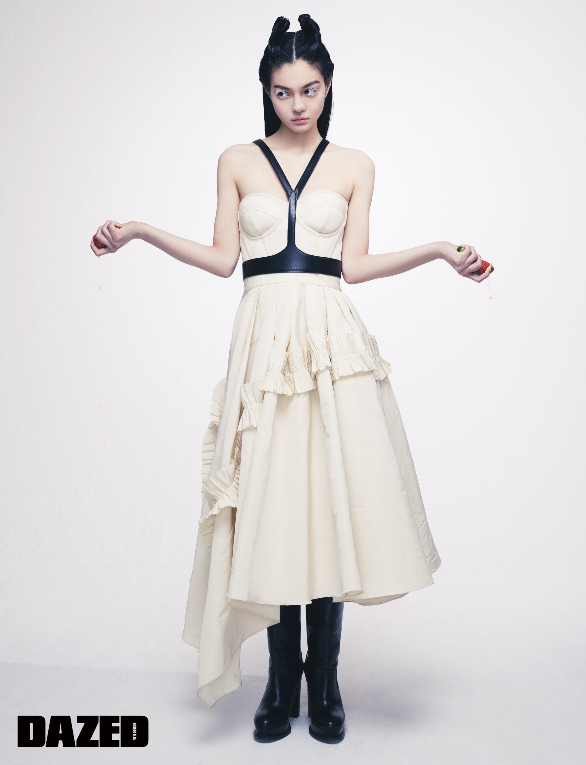 오프숄더 드레스와 부츠, 레더 하네스는 알렉산더 맥퀸(Alexander McQueen), 화이트 펄 네일 팁은 핑거수트(Finger Suit).