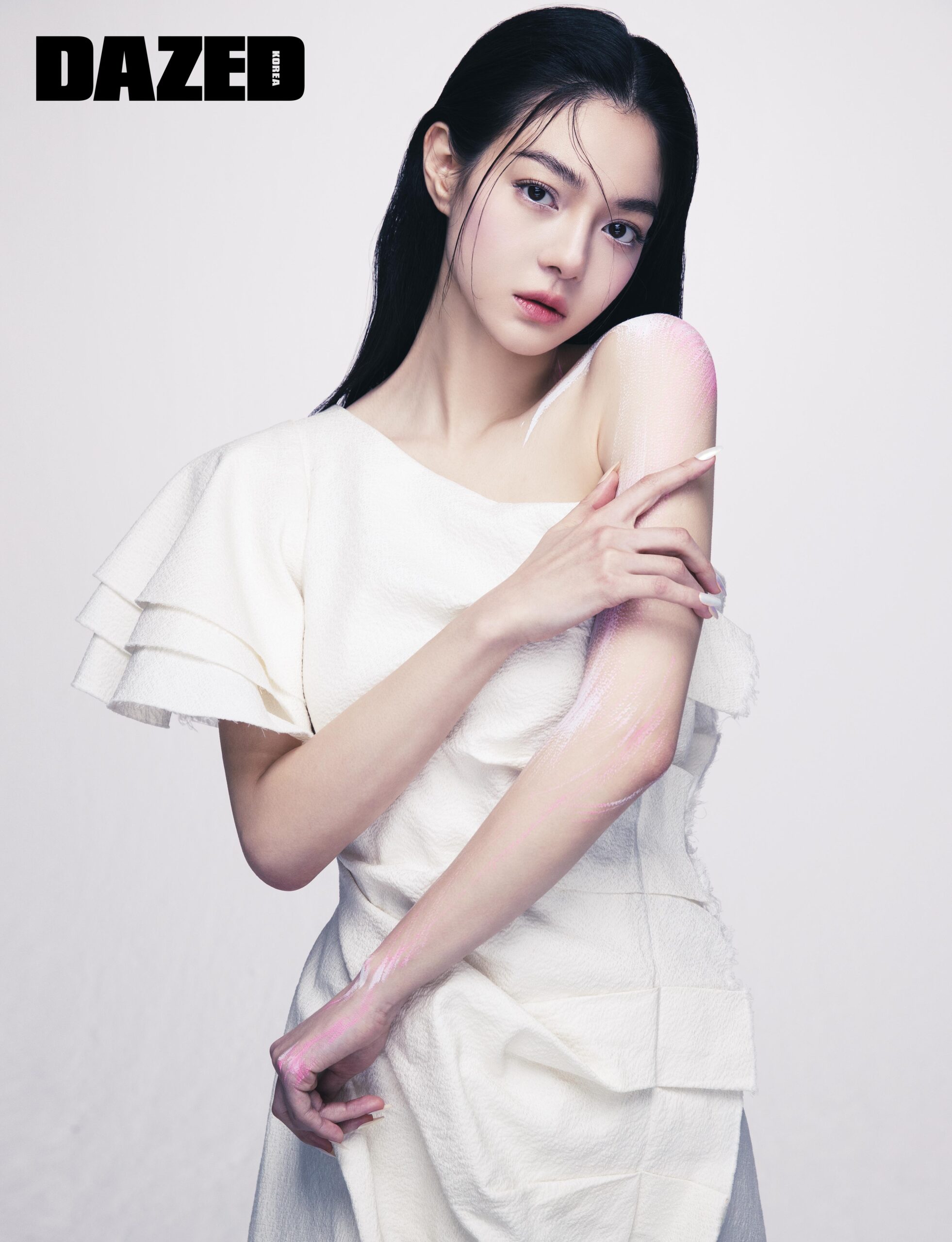 비대칭 오프숄더 드레스는 손정완(Son Jung Wan), 화이트 펄 네일 팁은 핑거수트(Finger Suit).