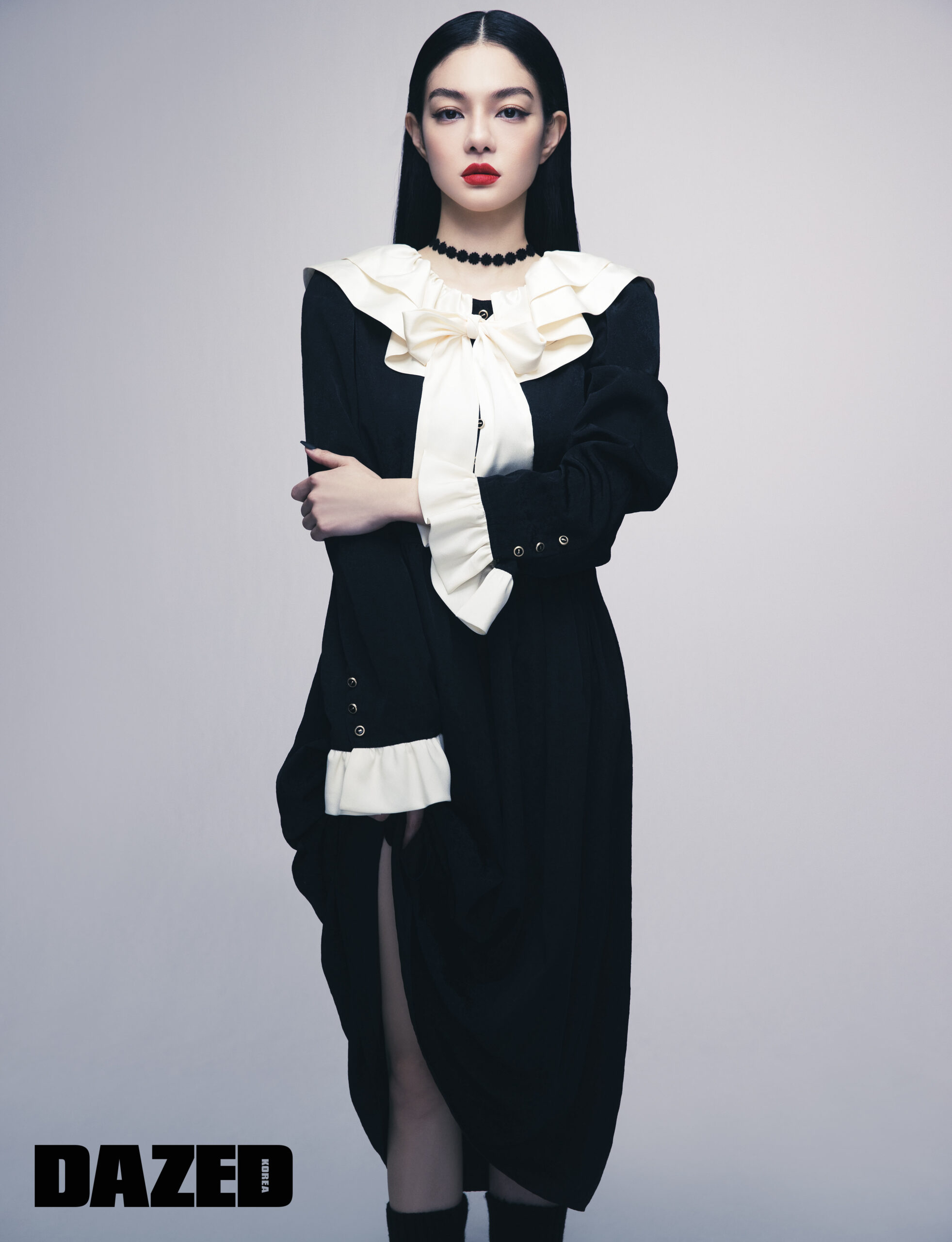 리본 디테일 드레스는 듀이듀이(Dew E Dew E), 매트 블랙 네일 팁은 핑거수트(Finger Suit), 레그 워머와 초커는 에디터의 것.