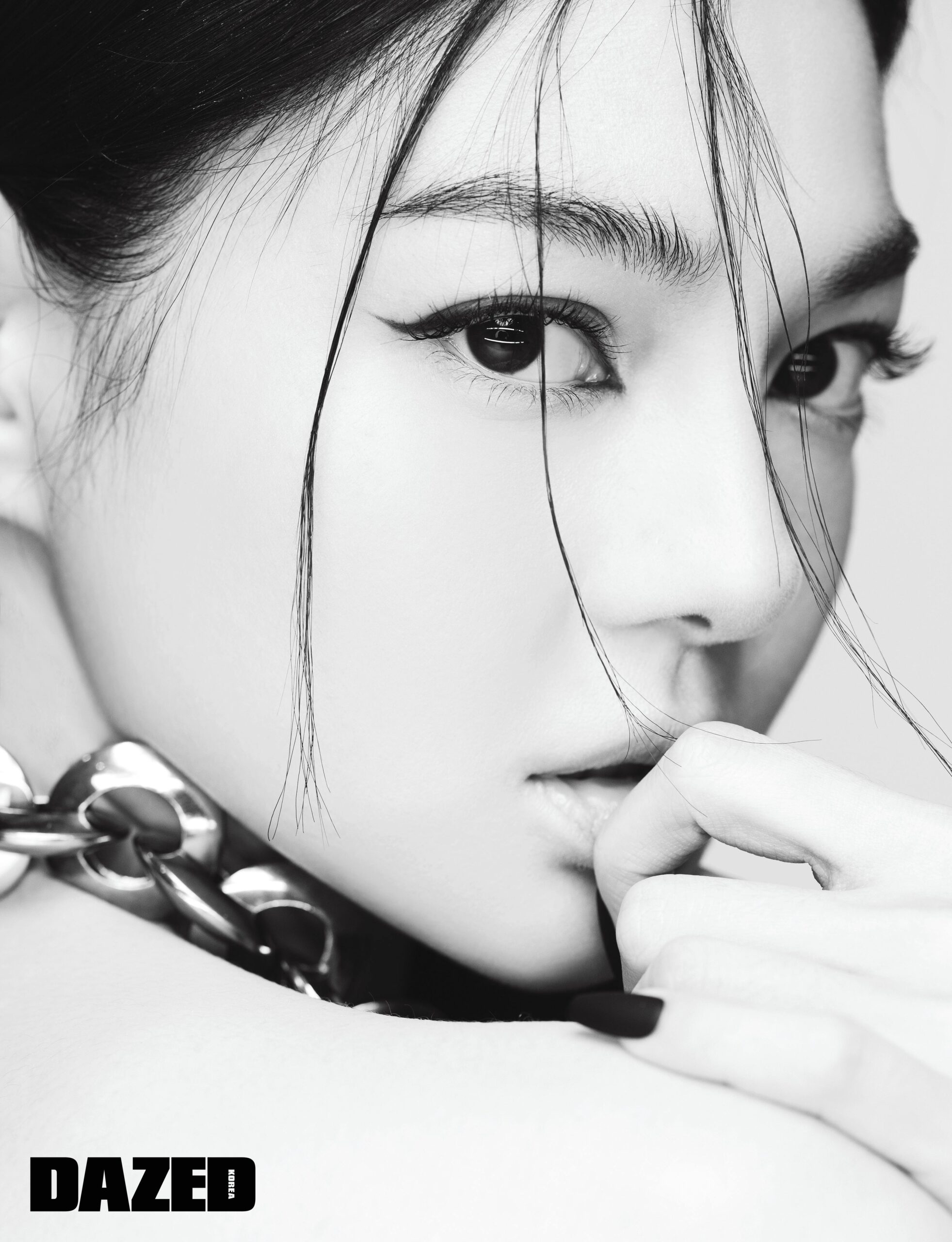 볼드 체인 네크리스는 알렉산더 맥퀸(Alexander McQueen), 매트 블랙 네일 팁은 핑거수트(Finger Suit).