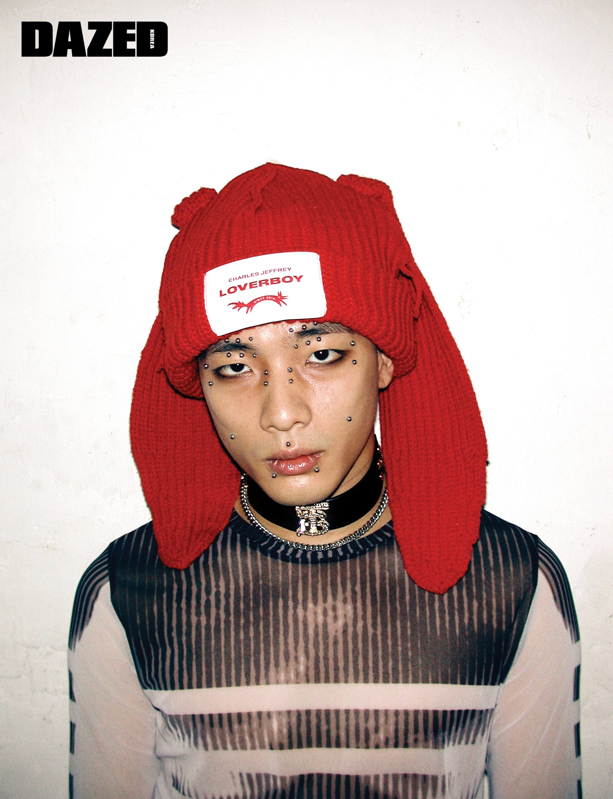 프린트 시스루 톱은 와이프로젝트 by 10 꼬르소 꼬모 서울(Y/Project by 10 Corso Como Seoul), 래빗 모티브 니트 비니는 찰스 제프리 러버보이 by 엠프티(Charles Jeffrey Loverboy by E( )PTY), 네크리스로 연출한 로고 엠블럼 레더 브레이슬릿은 버버리(Burberry).