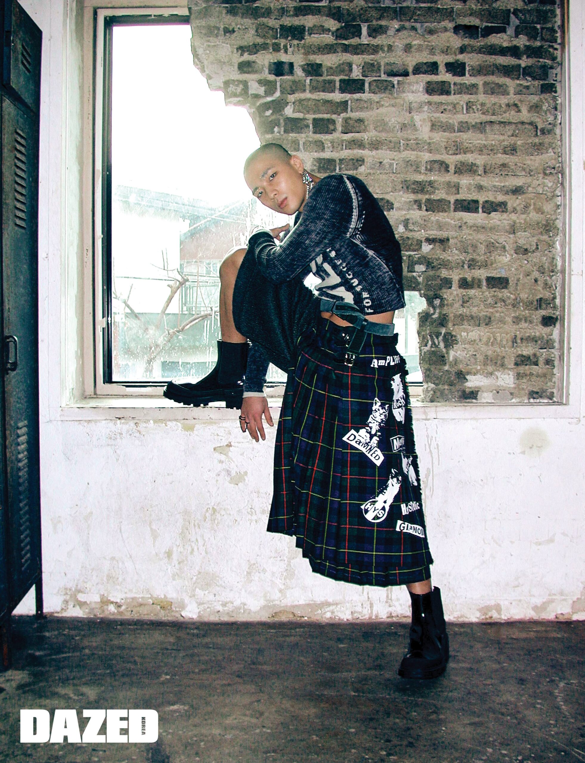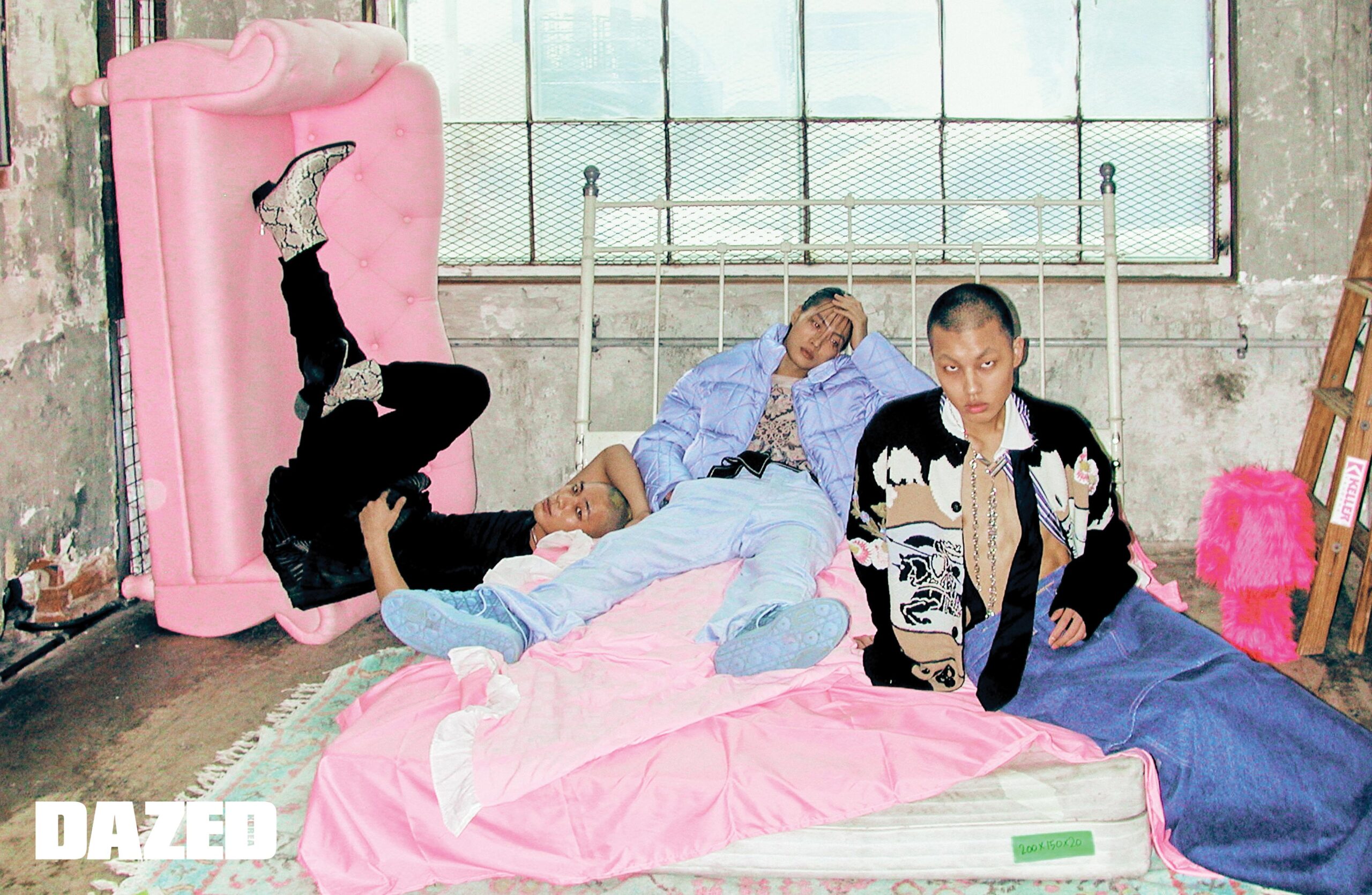 현호가 입은 플리츠 슬리브리스 톱은 굼허 by 엠프티(Goomheo by E( )PTY), 블랙 스웨트팬츠는 로에베(Loewe), 레이어링한 스커트는 찰스 제프리 러버보이 by 엠프티(Charles Jeffrey Loverboy by E( )PTY), 레오퍼드 패턴 부츠는 후망(Humant). 웅호가 입은 패딩 재킷과 코듀로이 팬츠, 로고 패턴 스니커즈는 모두 디올 맨(Dior Men), 타투 톱은 팸(P.A.M.), 벨트로 연출한 스카프는 듀이듀이(Dew E Dew E). 동하가 입은 엠브로이더리 디테일 카디건과 스트라이프 셔츠, 데님 롱스커트, 레이어링한 데님 스커트, 블랙 타이는 모두 버버리(Burberry), 실버 체인 네크리스는 키픔(Keepem).