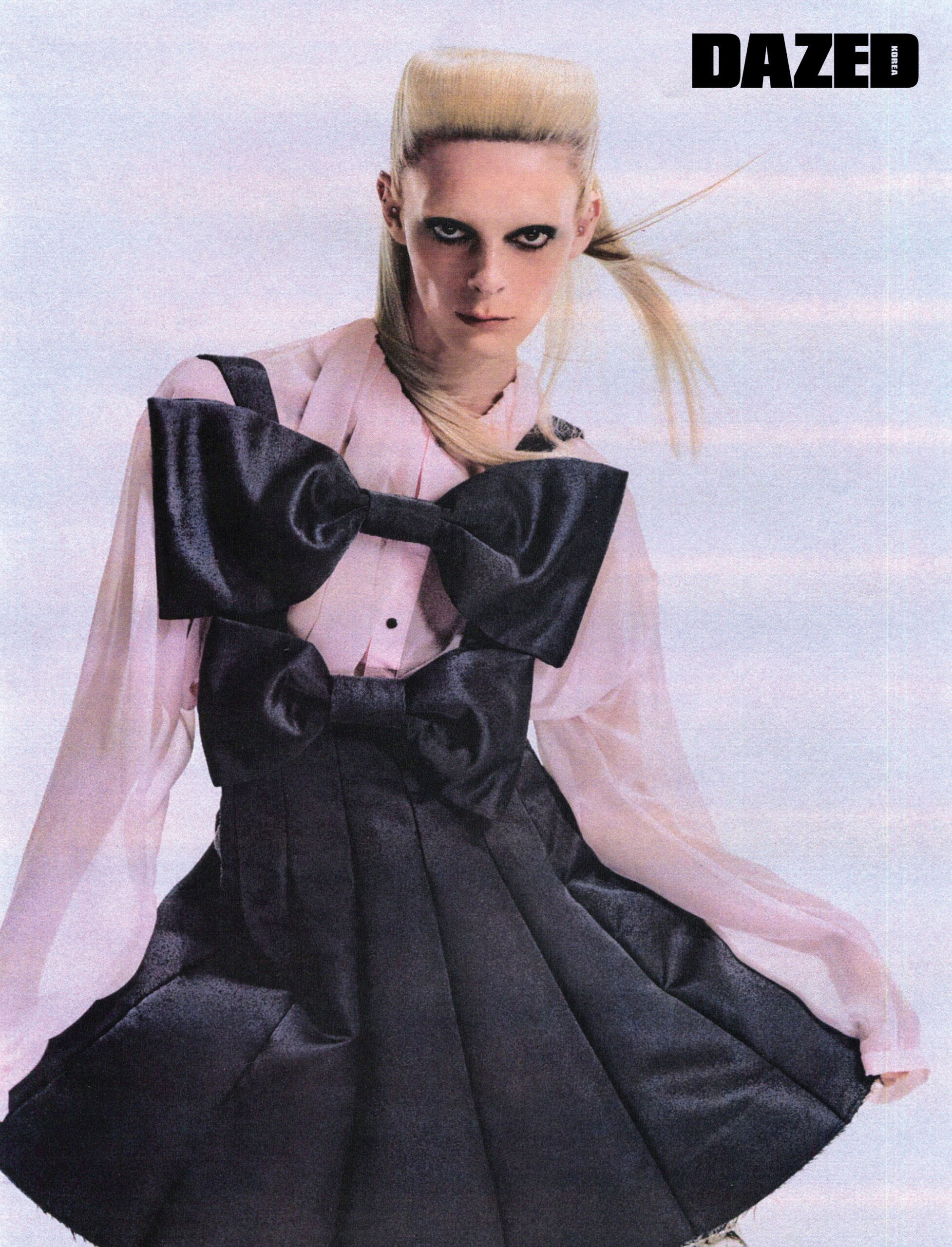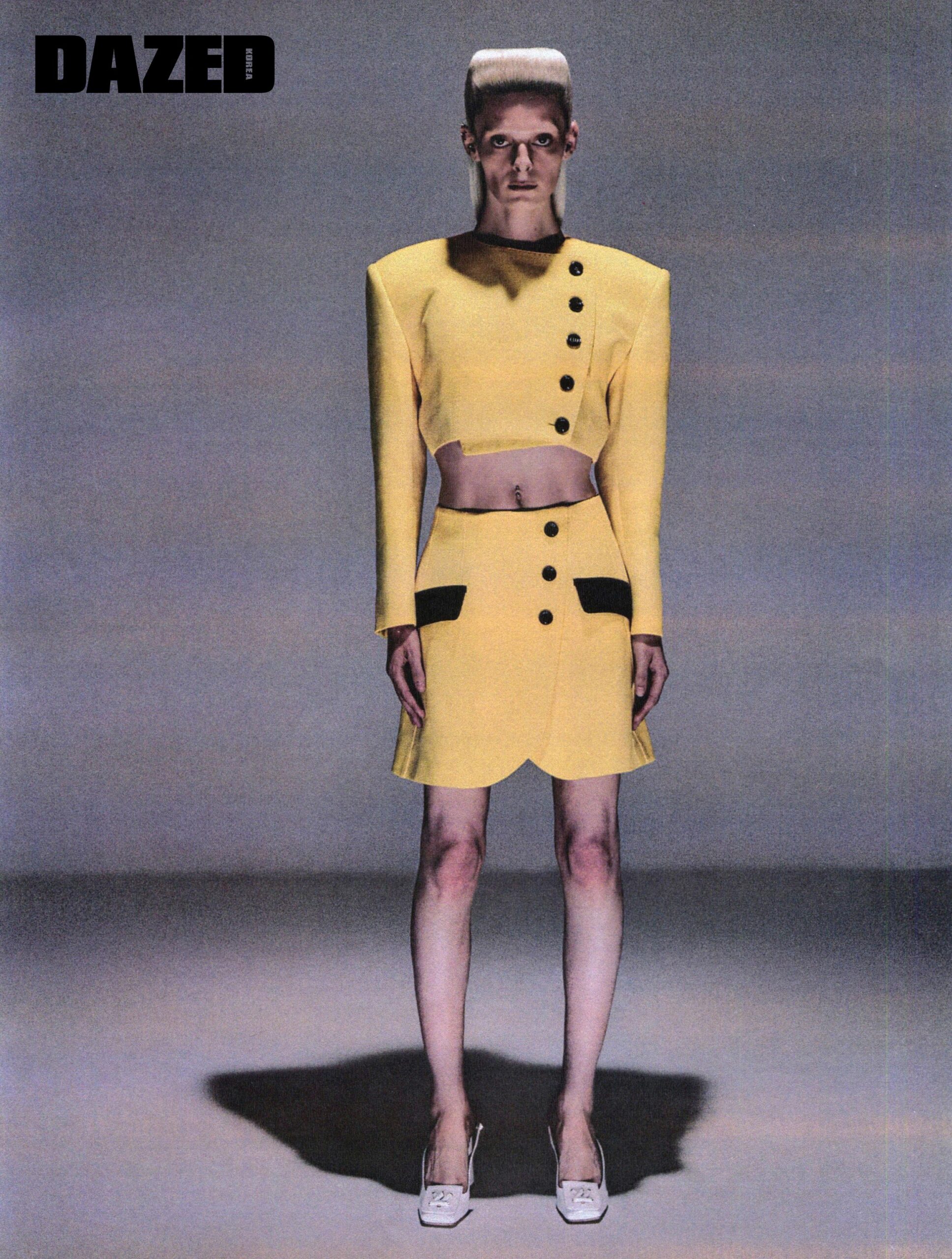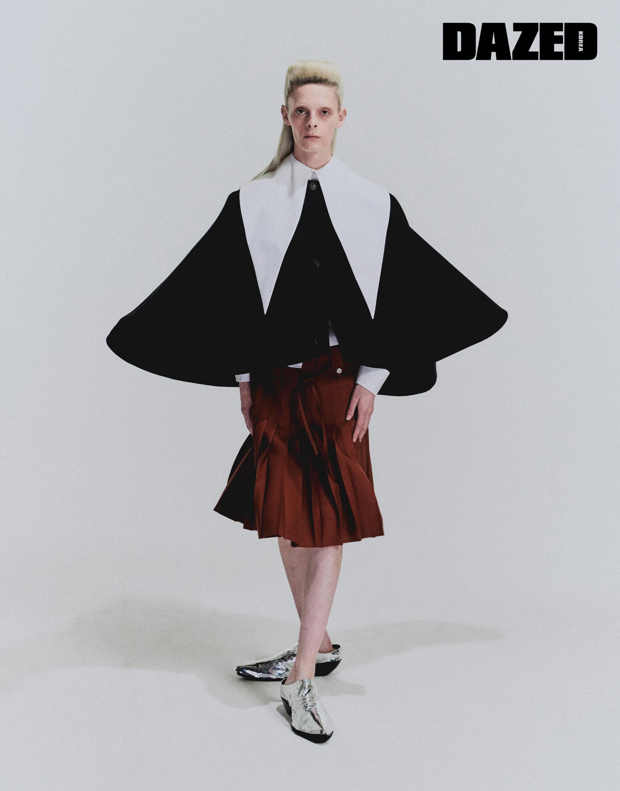 빅 칼라 셔츠는 느와 케이 니노미야(Noir Kei Ninomiya), 케이프와 스커트는 에곤랩 by 아데쿠베(Egonlab by Adekuver), 슈즈는 본(Bonbom).