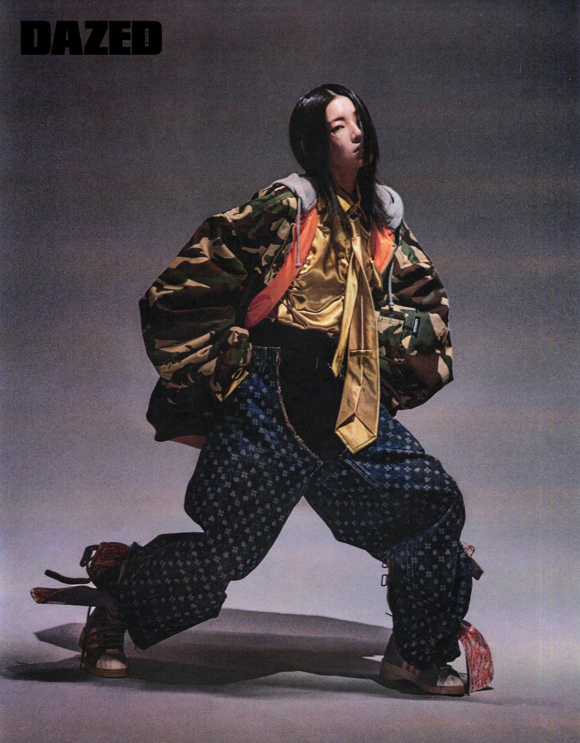 오버사이즈 재킷은 VTMNTS, 웨스턴 무드 데님 팬츠는 산쿠안즈 by 아데쿠베(Sankuanz by Adekuver), 실크 셔츠와 하이톱 스니커즈는 스타일리스트의 것.
