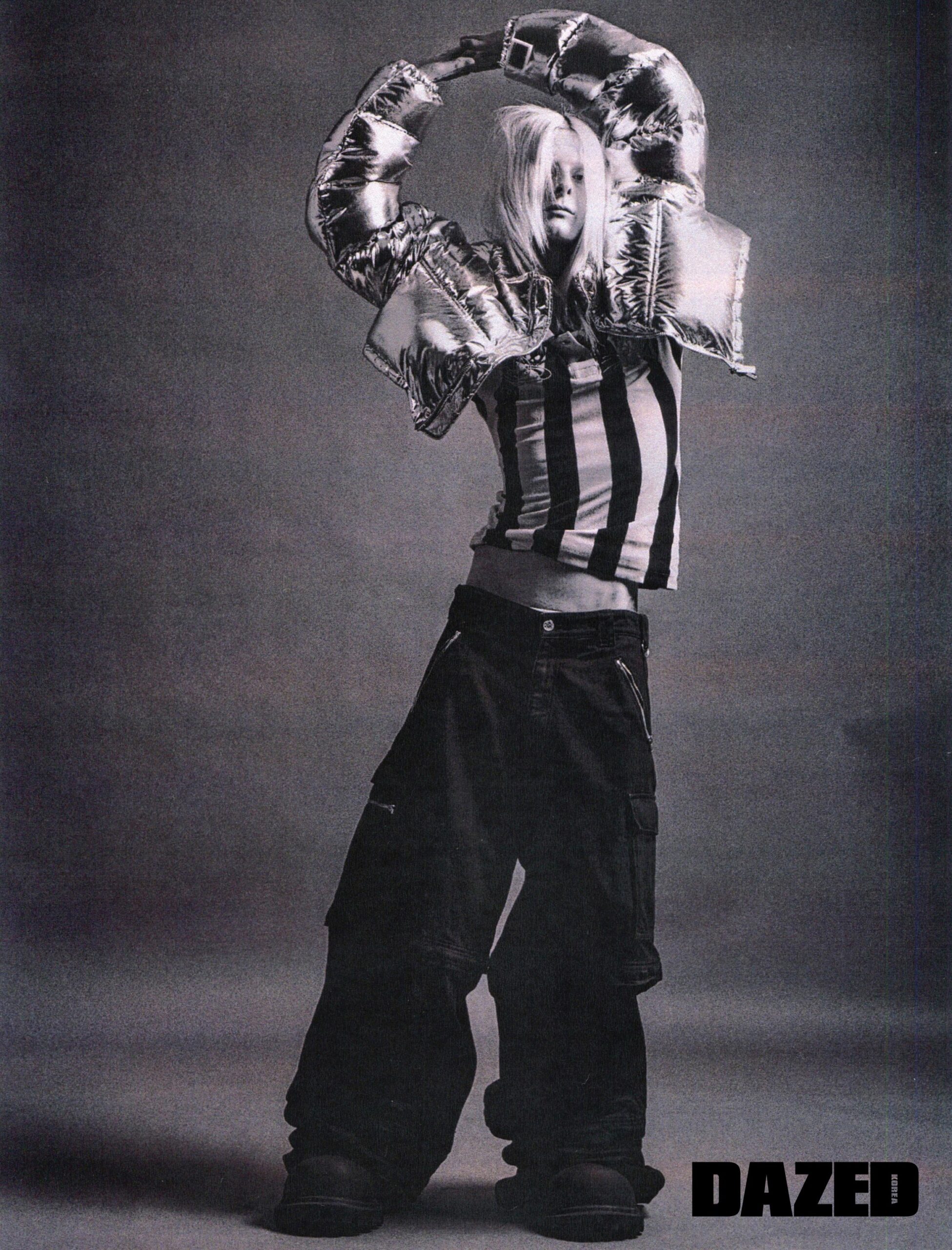크롭트 재킷과 오버사이즈 팬츠는 베트멍 by 분더샵(Vetements by BOONTHESHOP), 스트라이프 톱은 비비안 웨스트우드(Vivienne Westwood), 부츠는 발렌시아가(Balenciaga).
