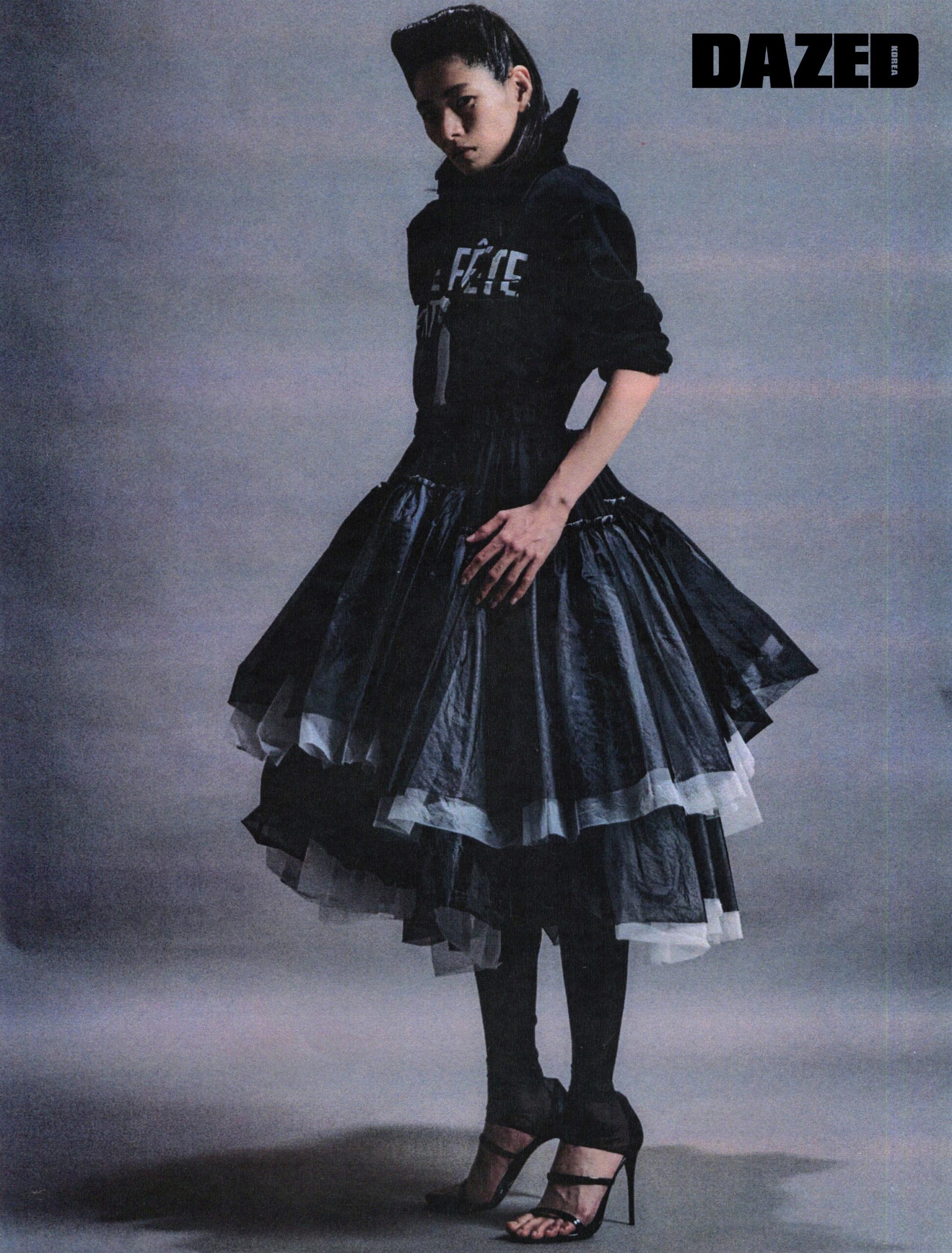 프린트 재킷은 라프 시몬스(Raf Simons), 티어스커트는 꼼데가르송(Comme des Garçons), 삭스 디테일 힐은 돌체앤가바나(Dolce&Gabbana).