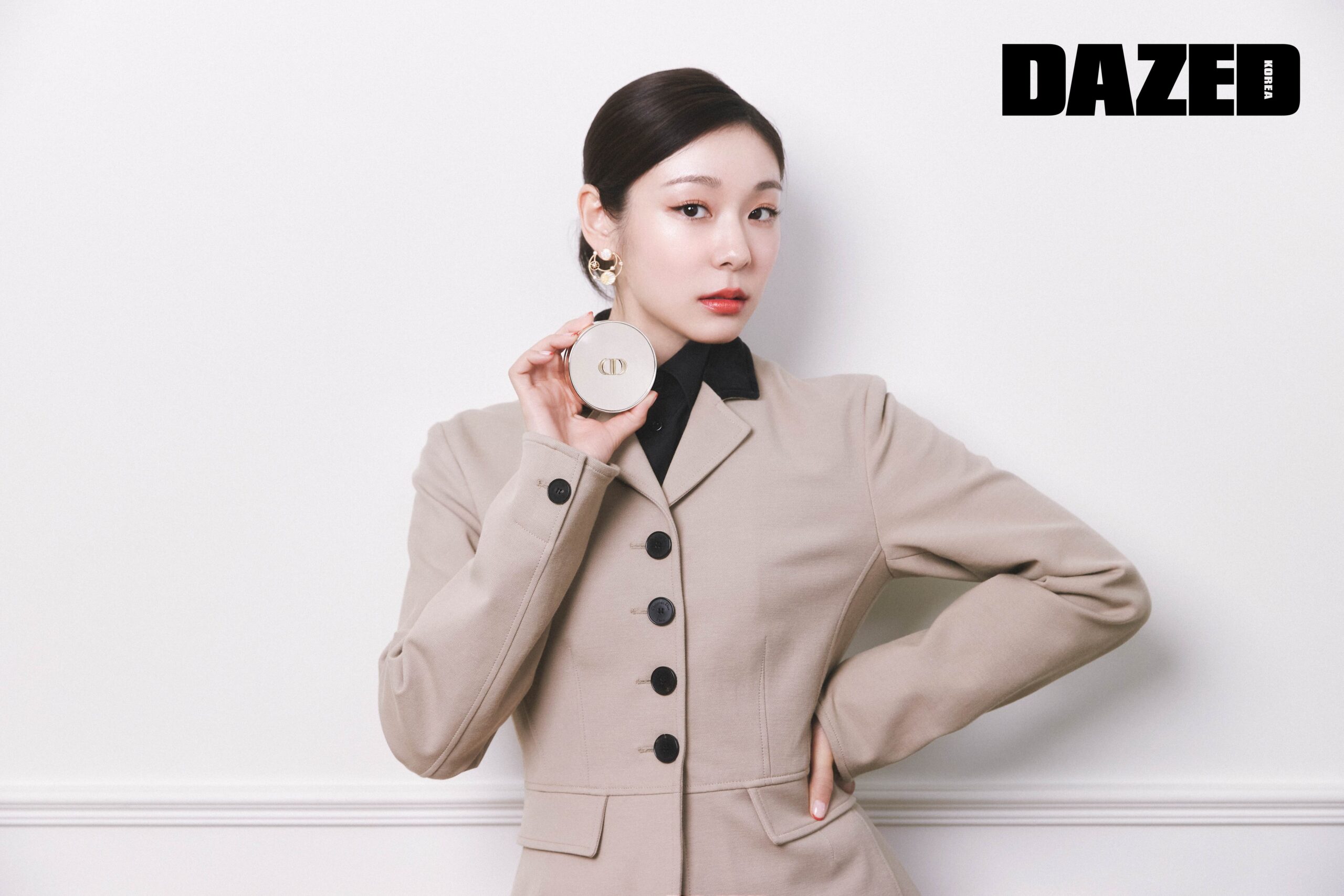풍부한 피그먼트를 함유해 장밋빛 광채를 선사하는 프레스티지 르 쿠션 뗑 드 로즈 슬림 #0N을 내장된 퍼프로 얼굴 전체에 가볍게 두드려 발라 우아하고 고급스러운 광채 피부를 연출한다. 디올 5 꿀뢰르 꾸뛰르 #649 누드 드레스의 핑크 브라운과 웜 브라운 컬러를 블렌딩해 눈두덩에 발라 깊이 있는 눈매를 만든 후, 디올쇼 24H 스틸로 #091 매트 블랙으로 정교하게 아이라인을 그린다. 같은 팔레트의 다크 브라운 컬러를 아이라인에 덧발라 부드러우면서도 선명한 아이 메이크업을 완성한다. 디올 백스테이지 로지 글로우 #004 코랄로 광대를 가볍게 터치해 생기와 화사함을 더한다. 맑은 오렌지 레드 컬러의 디올 어딕트 립스틱 #636 울트라 디올을 입술 전체에 발라 고급스럽고 우아한 분위기를 완성한다.
