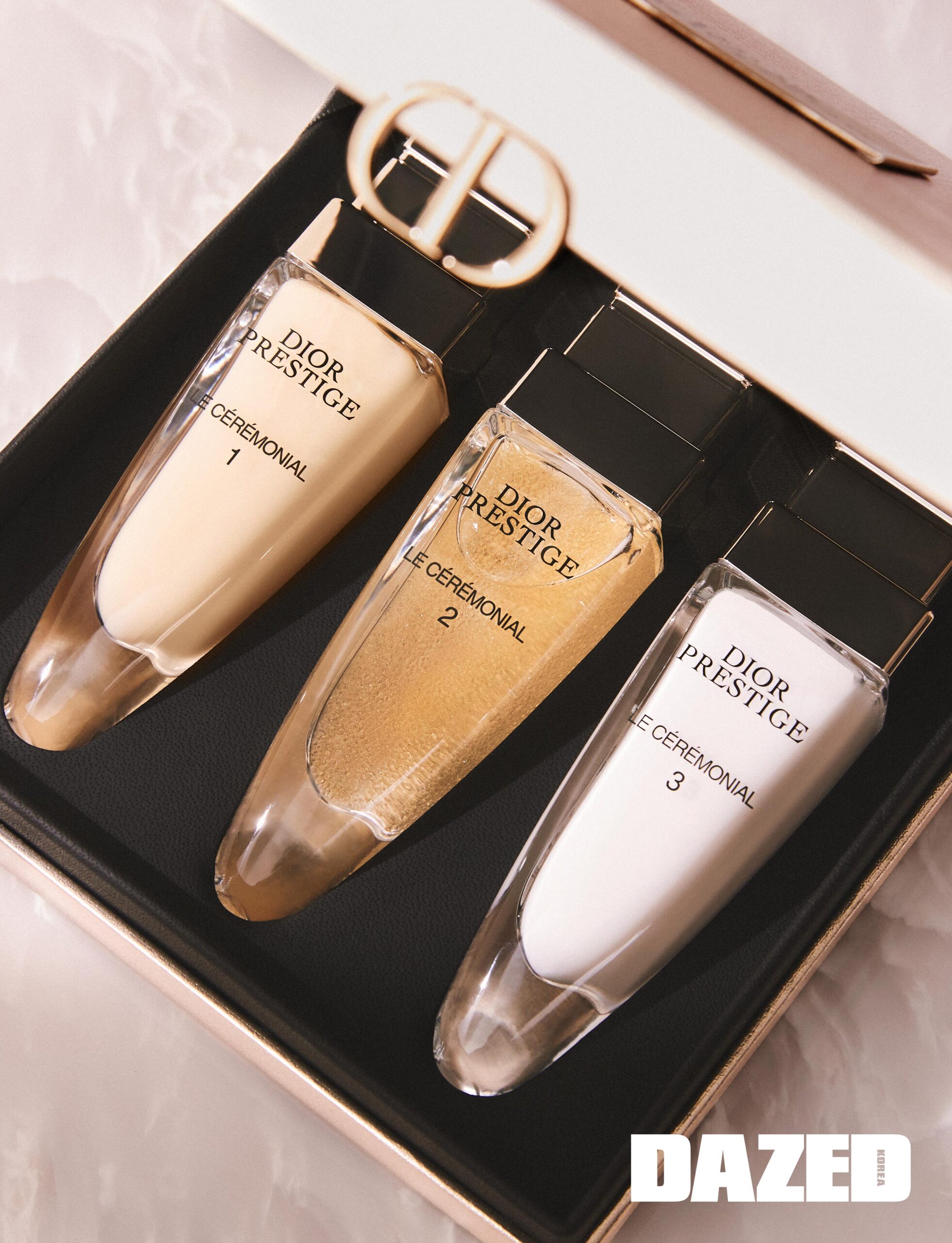 로즈 드 그랑빌의 핵심 성분을 농축한 각기 다른 세 가지 포뮬러가 트리플 피부 작용을 통해 강력한 3단계 안티에이징 효과를 발휘한다. 더욱 젊고 아름다운 피부로 가꿔주는 3주 집중 프로그램 디올 프레스티지 르 세레모니얼 15ml×3 234만원대, 크리스챤 디올 뷰티(Parfums Christian Dior).