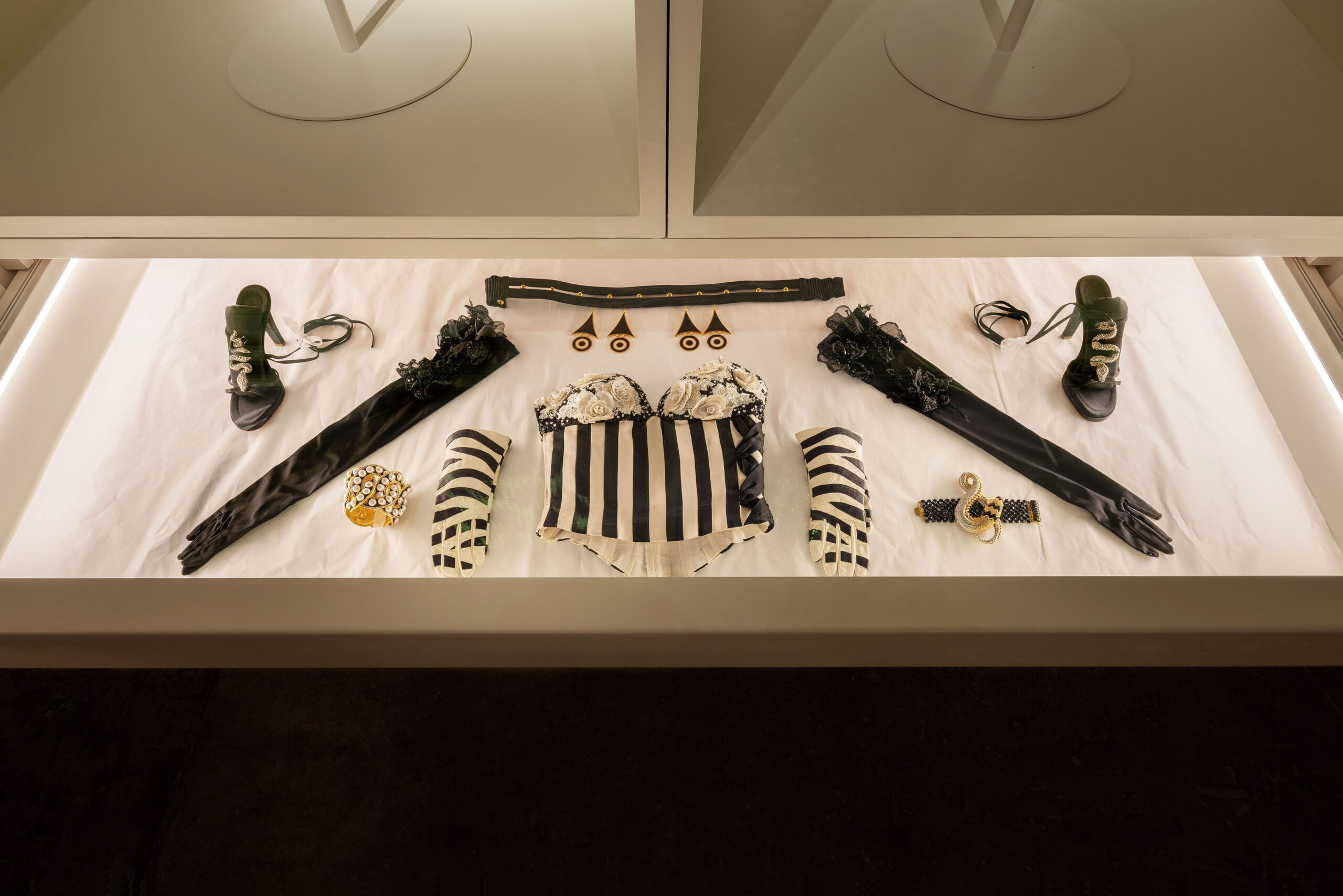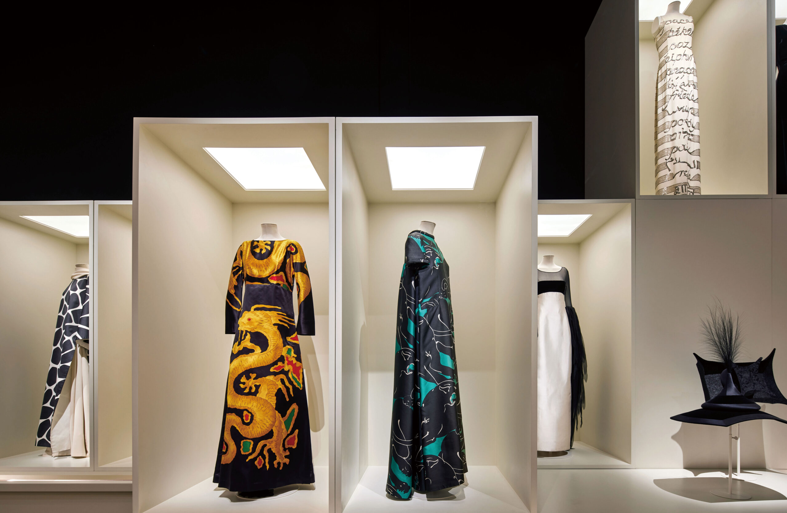 ‘Forever Valentino’ is really the brainchild of Pierpaolo Piccioli of Valentino, my fellow curator Massimiliano Gioni, and myself: and I feel like each of us had spaces that were ‘ours’, our passion, that we had a special resonance with, within the exhibition. For me, that space was the ARCHAEOLOGIES space, which is a re-imagining of the Maison Valentino archives held in their headquarters at the Palazzo Mignanelli in Rome. It’s kind of a sublime re-imagining – a heightened version, a fantasy archive. But nevertheless it does borrow its geography from archives around the world – the idea of clothes contained within wardrobe-like spaces, or concealed within drawers. The latter were actually a solution to a curatorial problem: I wanted (desperately!) to show the dress worn by Audrey Hepburn to the Rothschild’s Proust ball of 1971, but it was far too fragile to place on a mannequin. So we decided to exhibit it flat, which then evolved into the notion of replicating the archival drawers familiar to anyone who has visited the heritage department of a fashion house. There is an added slight sense of theatricality to this display notion – I like the idea of a denoument, a revelation, opening a drawing and finding something wonderful. For me, archives aren’t dusty repositories of past ideas: they are vibrant, alive spaces, full of possibilities and unexpected discoveries. I loved the idea of people opening drawers and being as excited as I was – and am – to discover what lies inside. We also used the space as a whole to evoke that notion – hiding outfits from immediate view, so it was constantly a voyage of discovery as you passed through the space. That’s why we called the space Archaeologies – the idea that you had to dig or hunt, to unearth treasures.