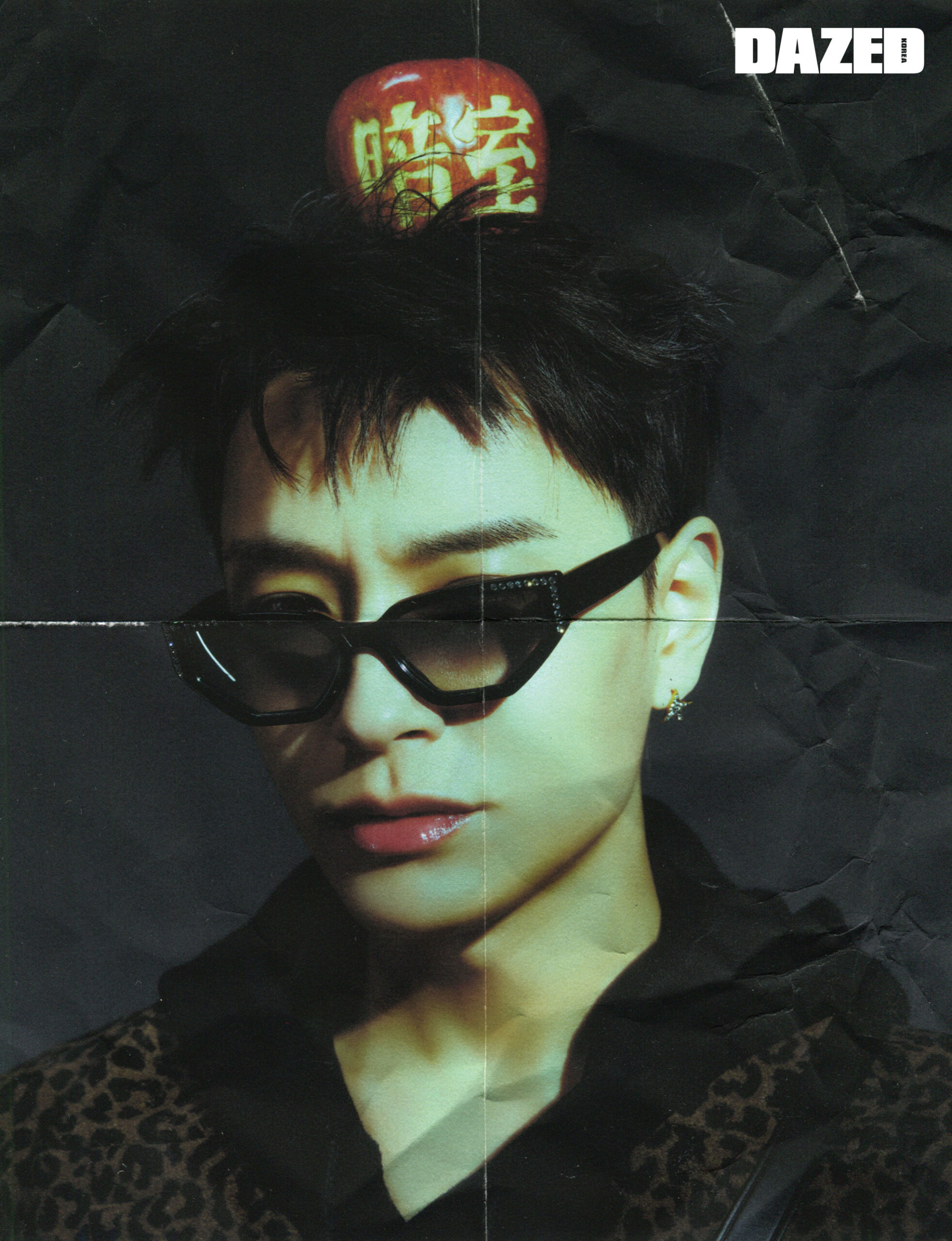 애니멀 프린트 울 싱글 코트와 스타 컬렉션 블랙 후디, 크리스털이 돋보이는 선글라스, 스타 스터드 이어링은 모두 골든구스(Golden Goose).