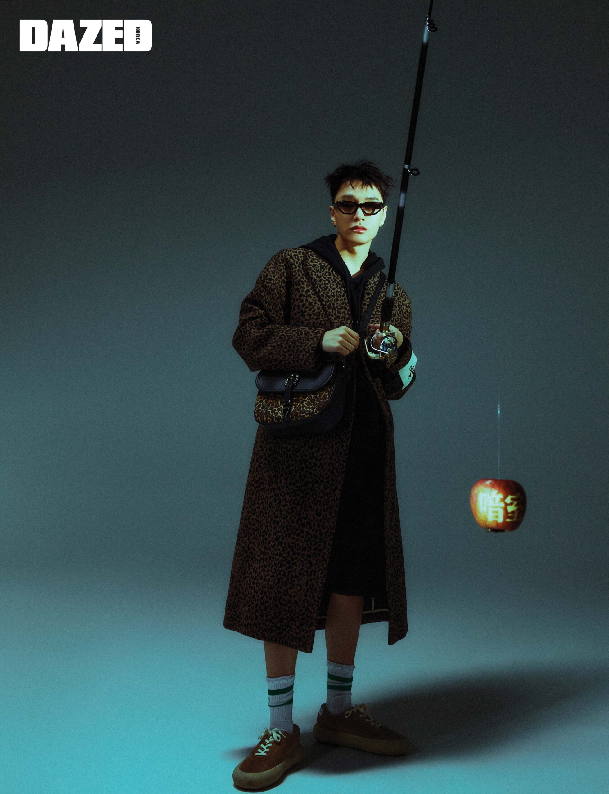 애니멀 프린트 울 싱글 코트와 스타 컬렉션 블랙 후디, 하프 팬츠, 크리스털이 돋보이는 선글라스, 스터드 이어링, 레오퍼드 프린트 로데오 백, 스웨이드 소재의 스페이스-스타 스니커즈, 삭스는 모두 골든구스(Golden Goose).