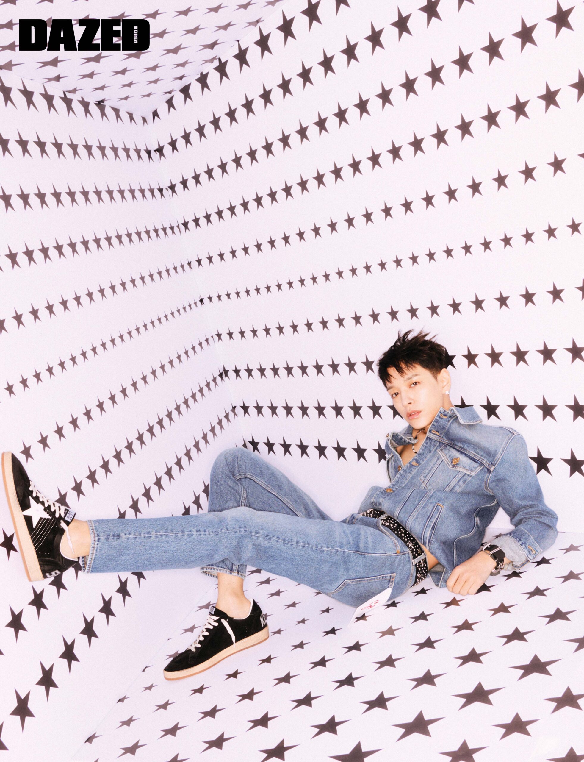 G 패치 포인트의 골든 컬렉션 데님 재킷과 워싱 슬림 진, 스웨이드 소재의 블랙 볼스타 스니커즈, 크리스털 스터드 이어링은 모두 골든구스(Golden Goose), 비즈 네크리스와 브레이슬릿은 스타일리스트의 것.