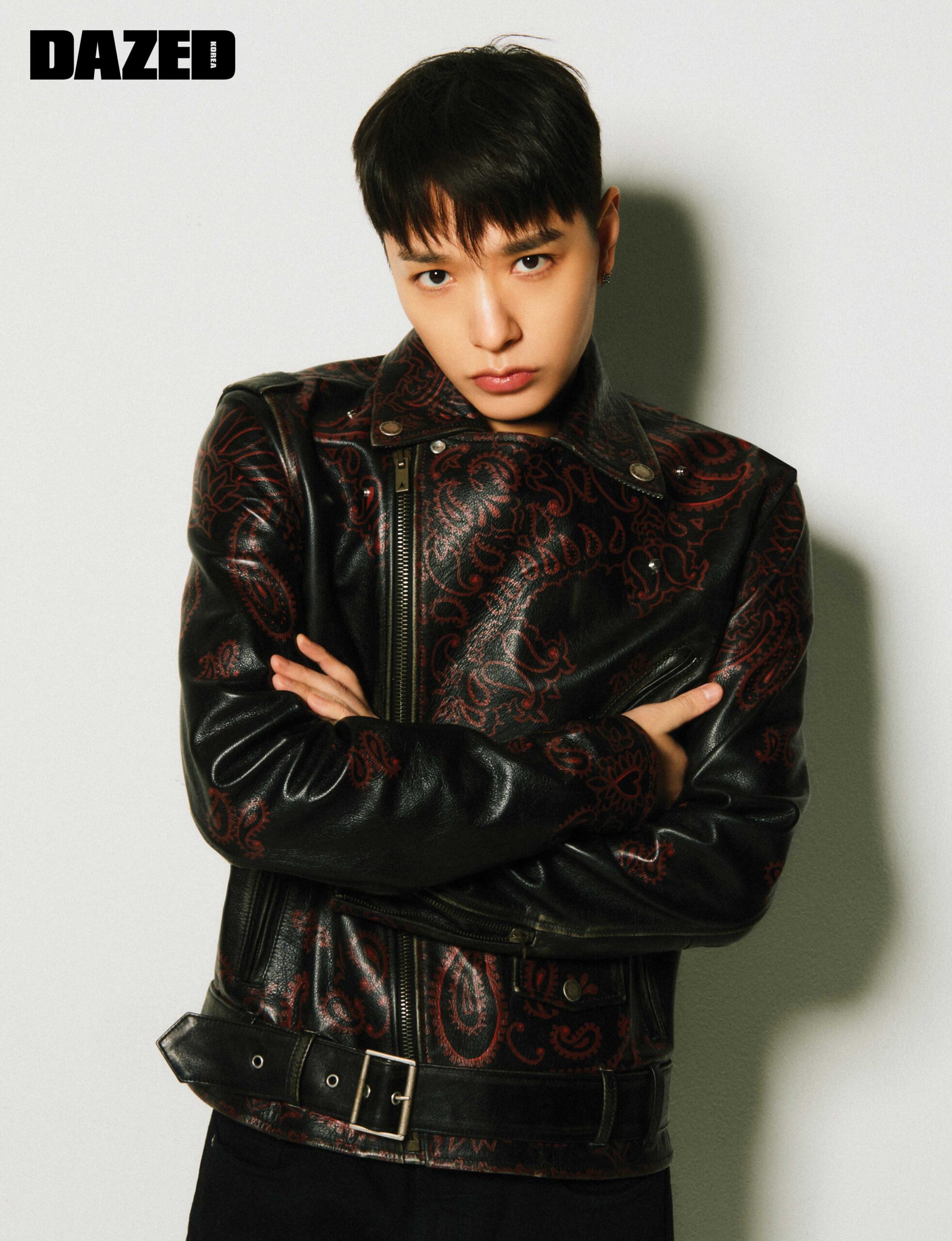 사이먼 도미닉을 위해 제작한 코크리에이션 레더 재킷과 슬림 핏 데님, 크리스털 스터드 이어링은 모두 골든구스(Golden Goose).