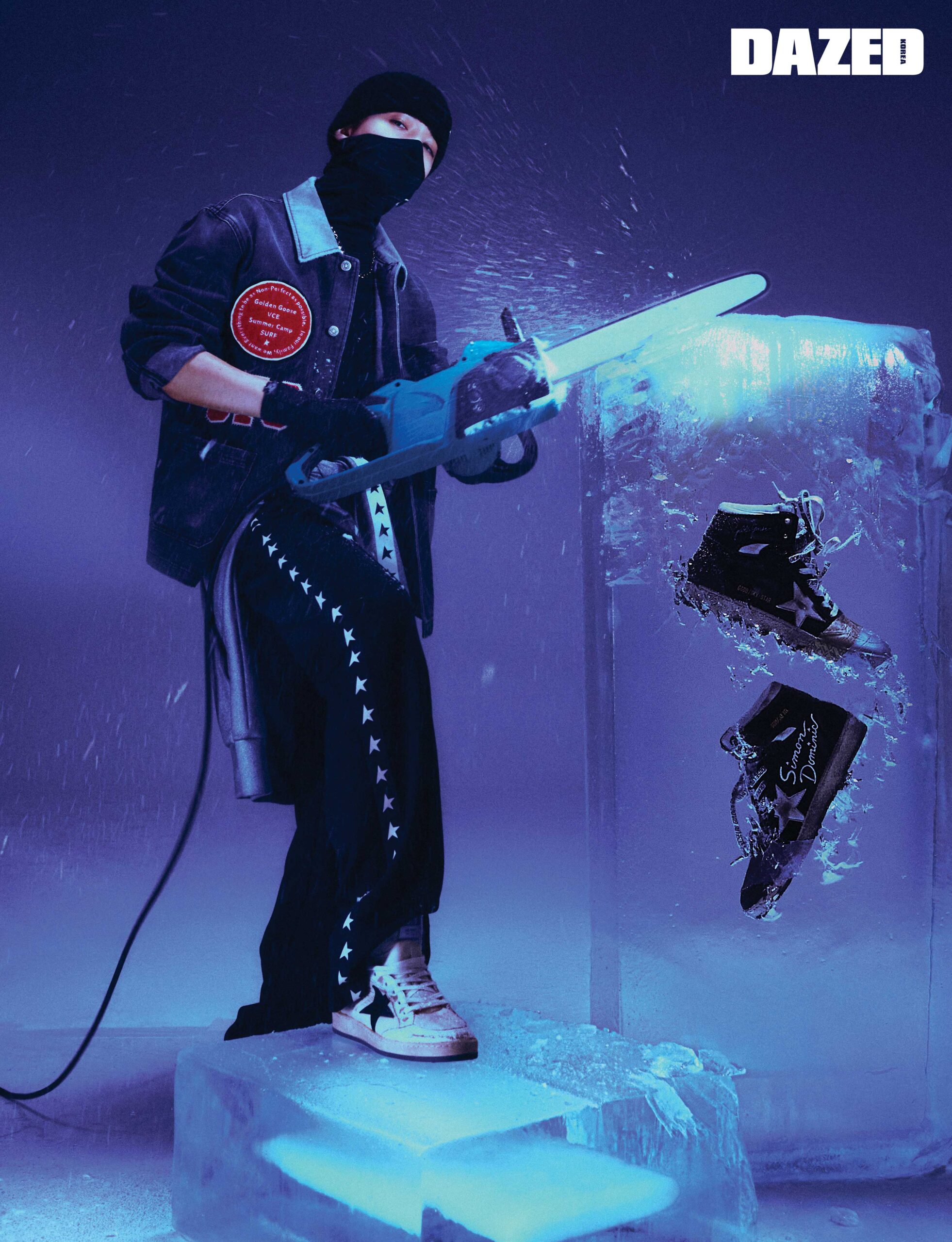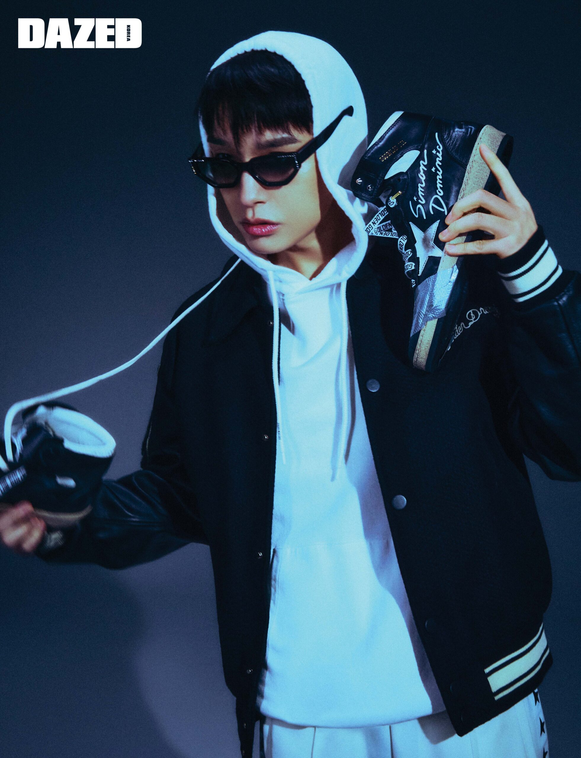 패치 포인트의 골든 컬렉션 블루종 재킷과 사이먼 도미닉만의 코크리에이션 디자인이 담긴 스카이-스타 스니커즈, 스타 로고가 돋보이는 스타 컬렉션 후디, 와이드 팬츠, 볼스타 스니커즈, 크리스털 디테일 선글라스는 모두 골든구스(Golden Goose).
