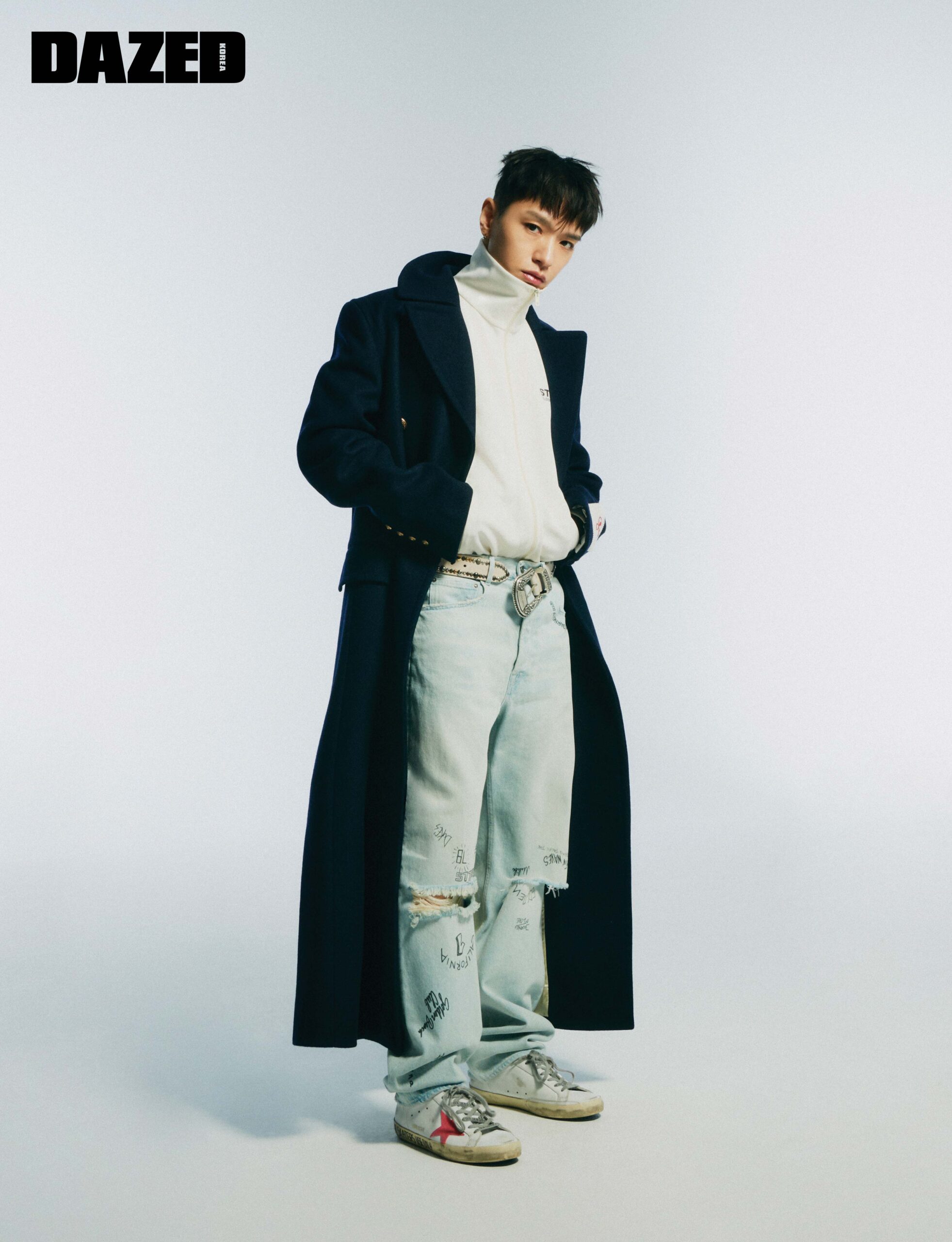 스타 컬렉션 트랙자켓과 골든 컬렉션 더블브레스트 코트, 디스트레스드 포인트와 레터링이 돋보이는 데님, 스터디드 벨트, 슈퍼-스타 스니커즈는 모두 골든구스(Golden Goose).
