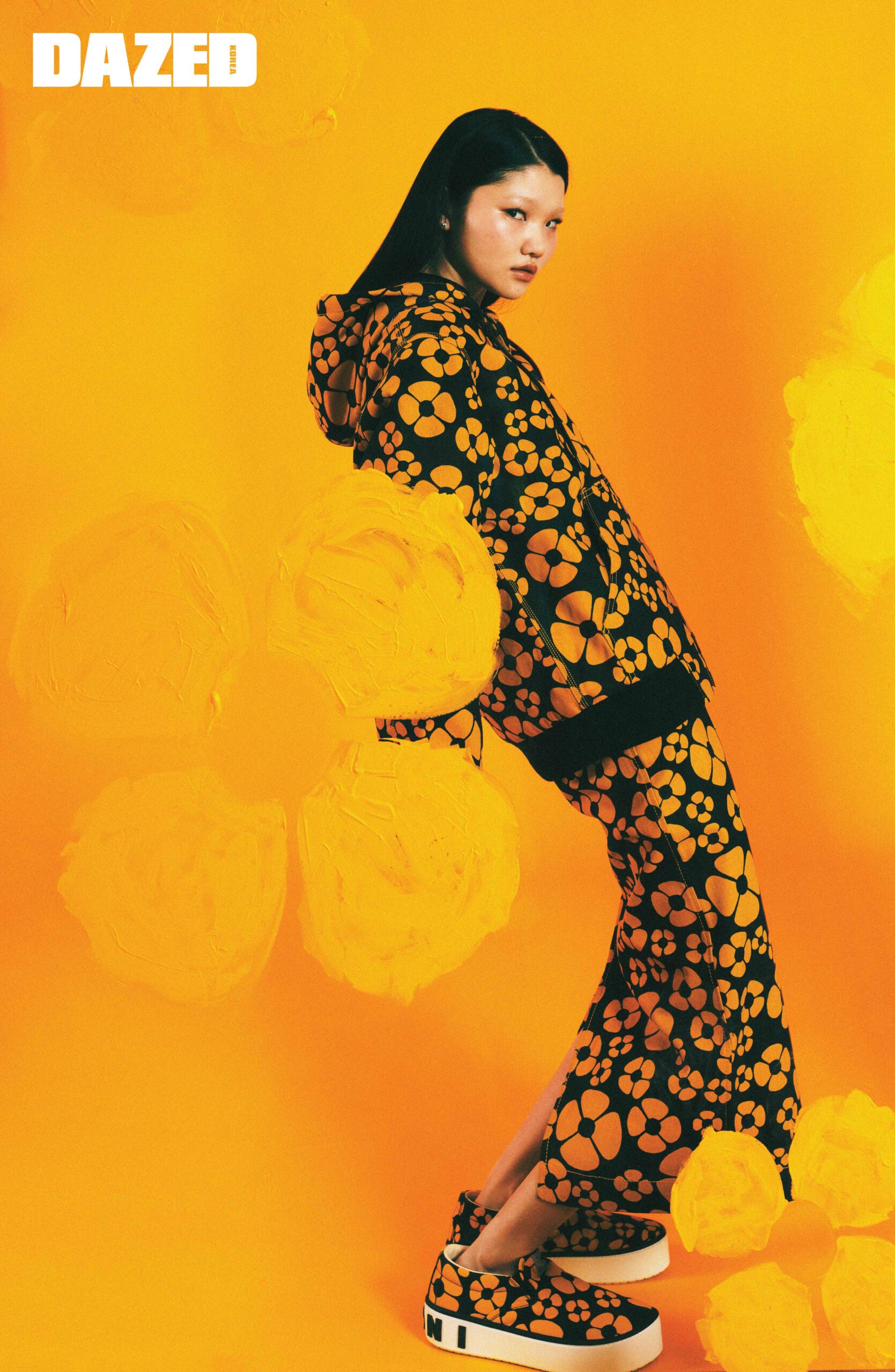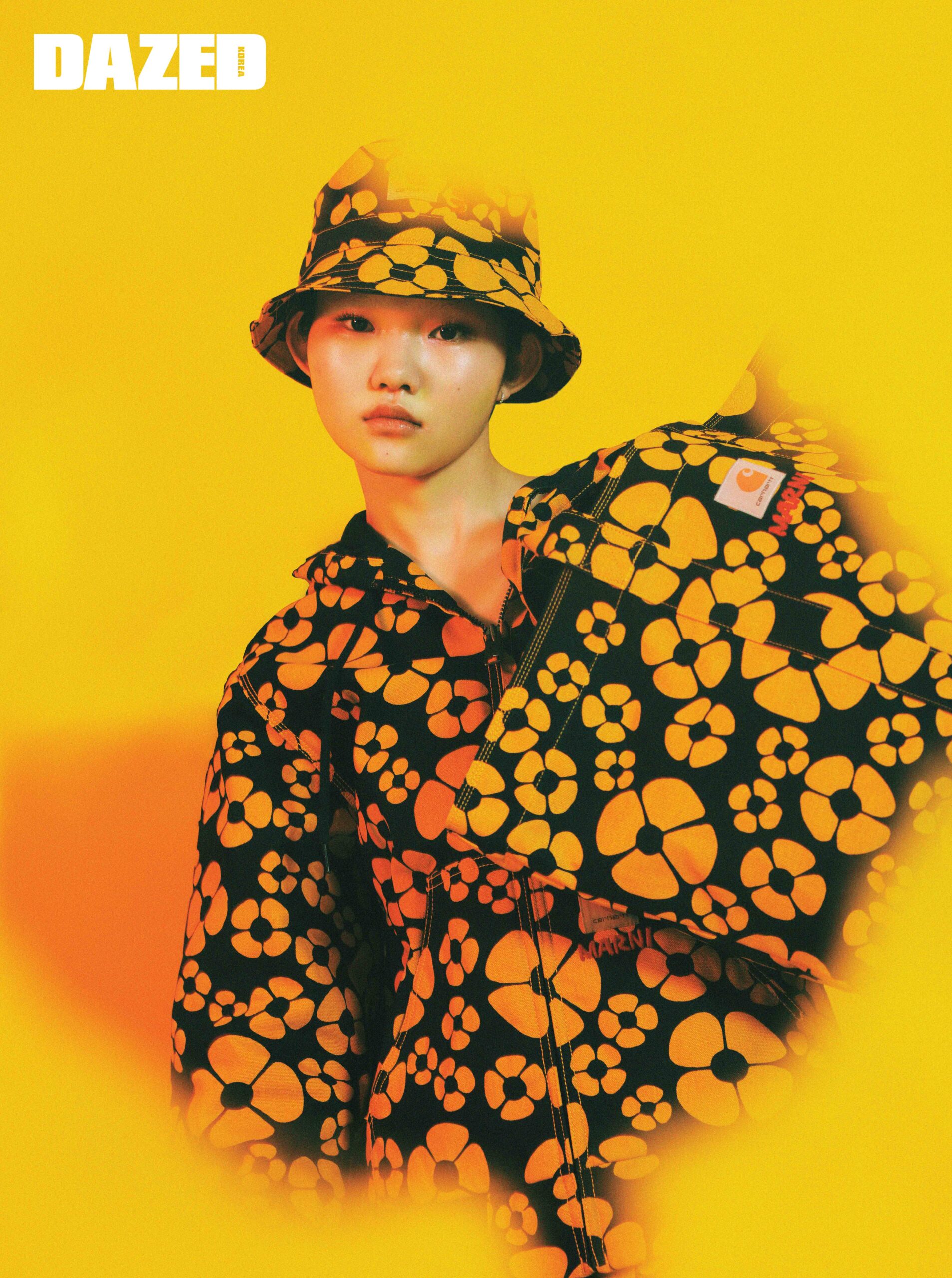 옐로 마르니 플로럴 프린트가 돋보이는 코튼 캔버스 소재의 후드 재킷과 미디스커트, 옐로 마르니 플로럴 프린트와 마르니 레터링이 돋보이는 슬립온 스니커즈는 모두 마르니×칼하트 WIP(Marni×Carhartt WIP).