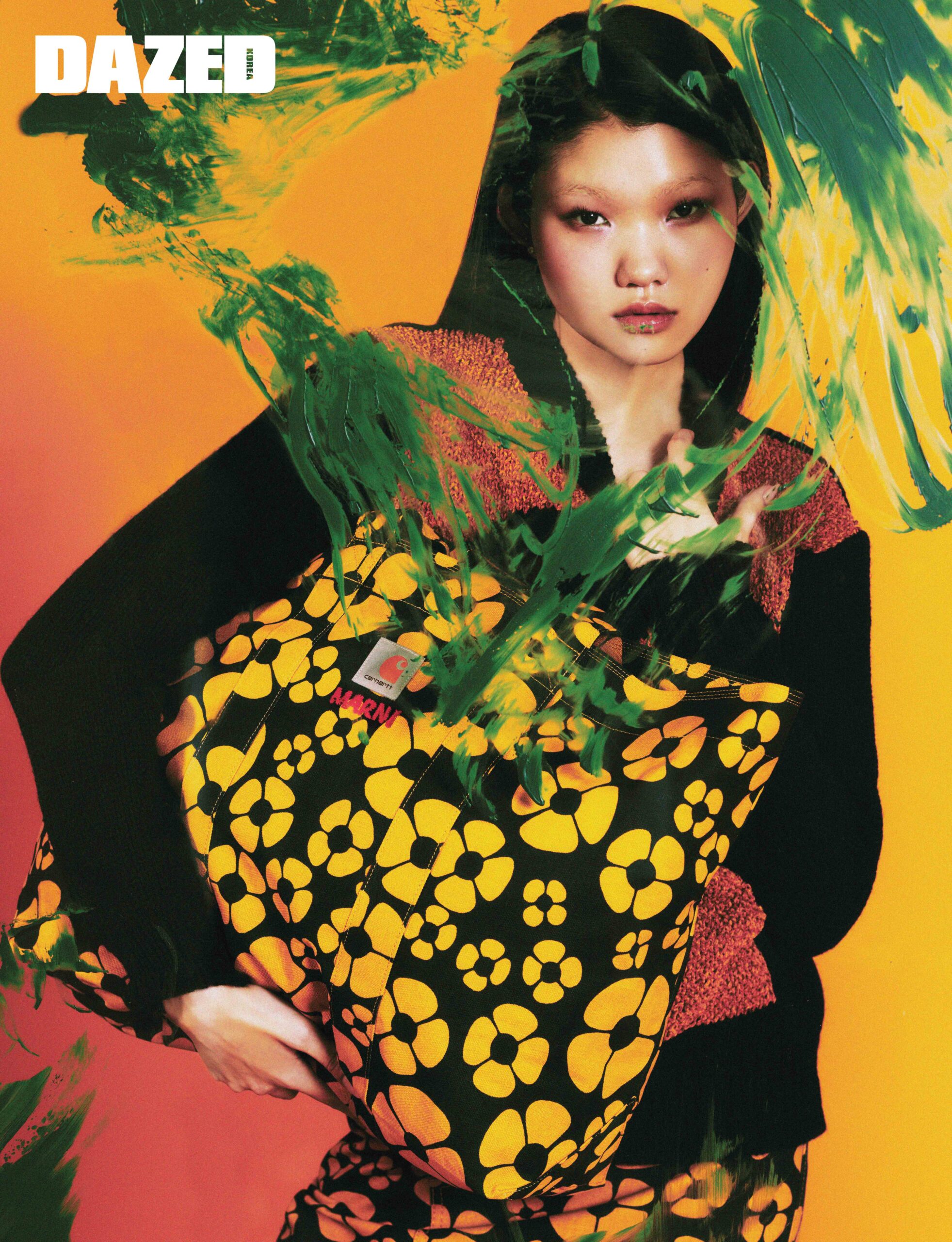 마르니와 칼하트 컬러 블록 엠블럼이 돋보이는 울 소재 니트 톱, 옐로 마르니 플로럴 프린트가 돋보이는 코튼 캔버스 소재 미디스커트, 그린 마르니 플로럴 프린트 장식의 쇼퍼 백은 모두 마르니×칼하트 WIP(Marni×Carhartt WIP).