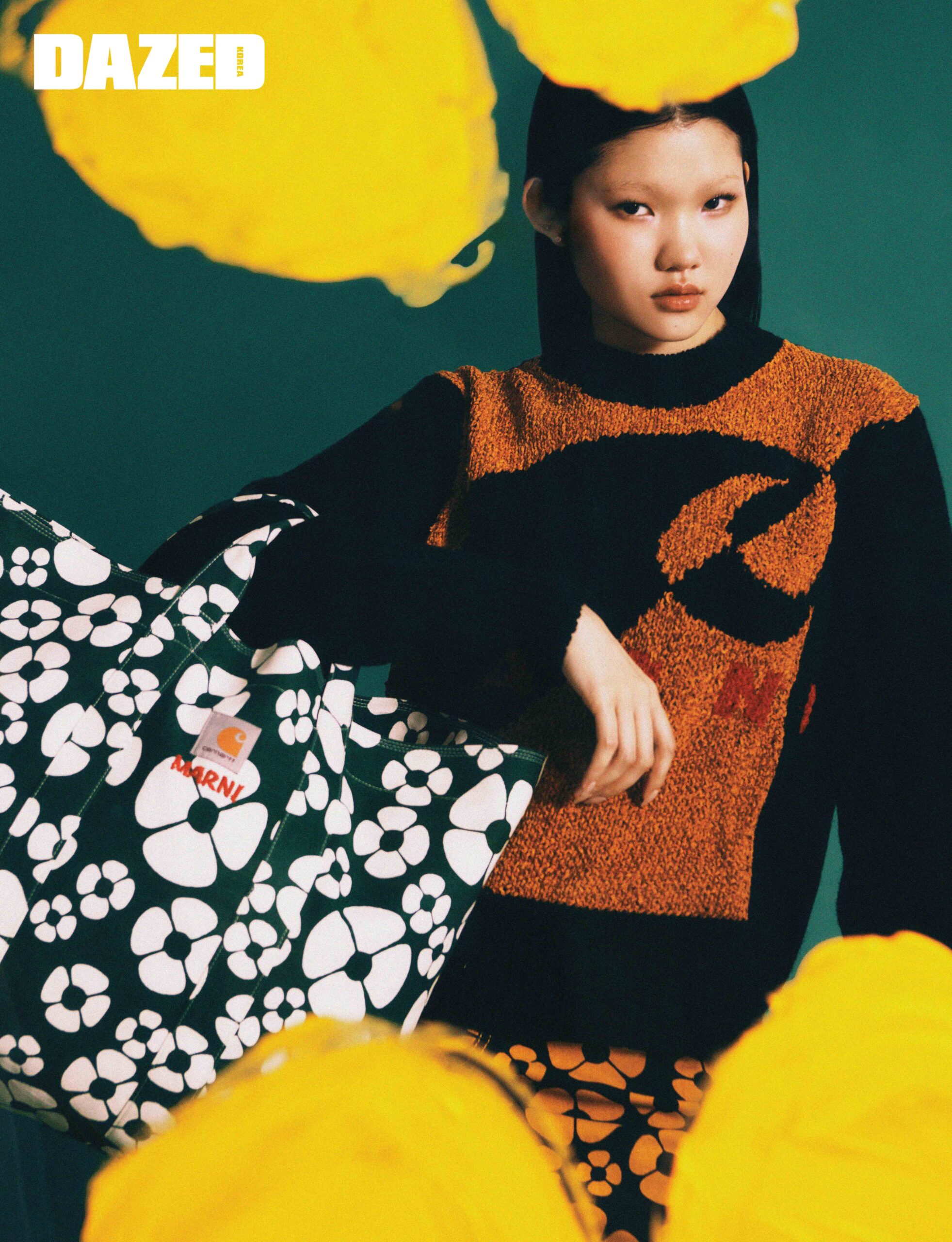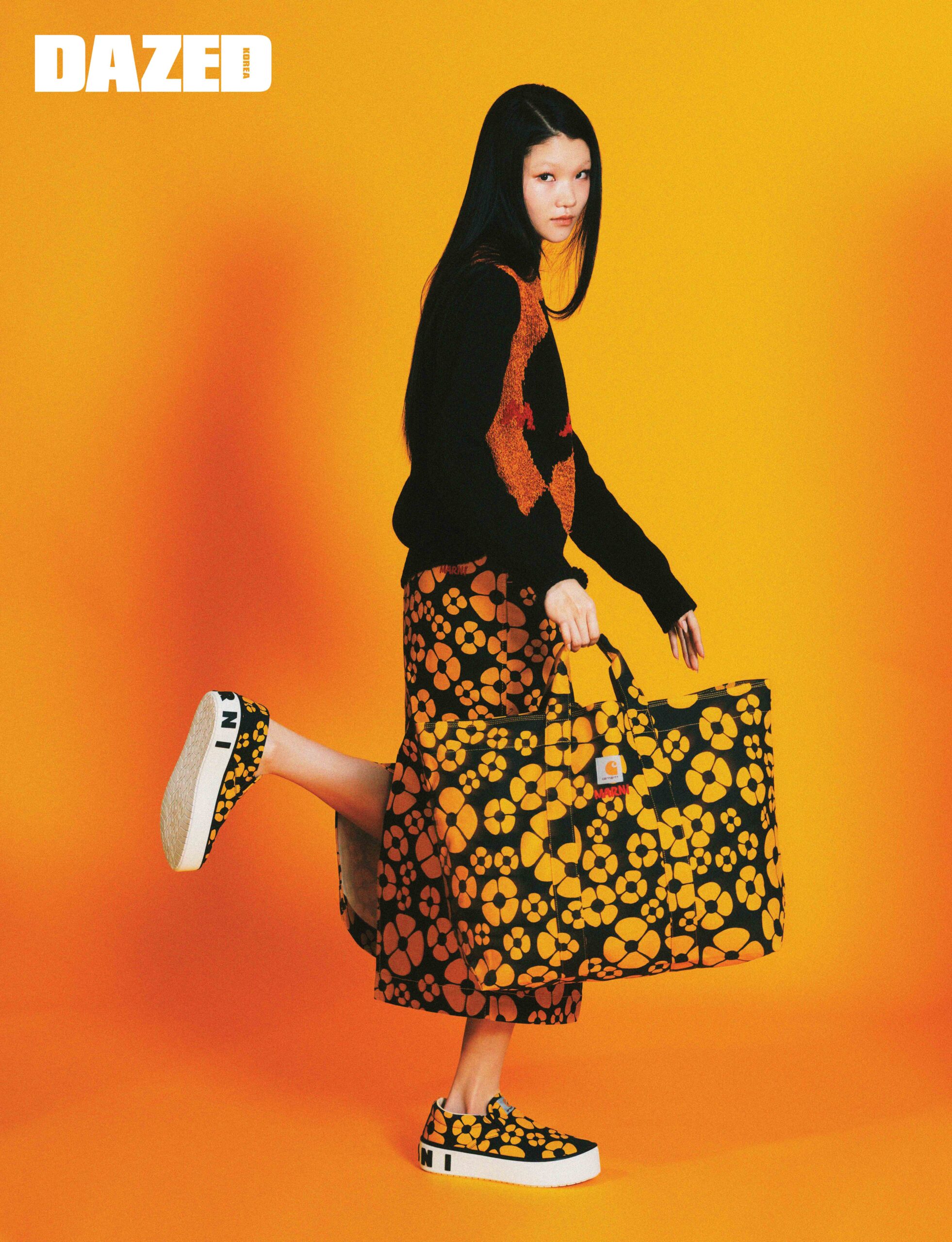 마르니와 칼하트 컬러 블록 엠블럼이 돋보이는 울 소재 니트 톱, 옐로 마르니 플로럴 프린트가 돋보이는 코튼 캔버스 소재의 미디스커트, 옐로 마르니 플로럴 프린트 장식 쇼퍼 백은 모두 마르니×칼하트 WIP(Marni×Carhartt WIP).