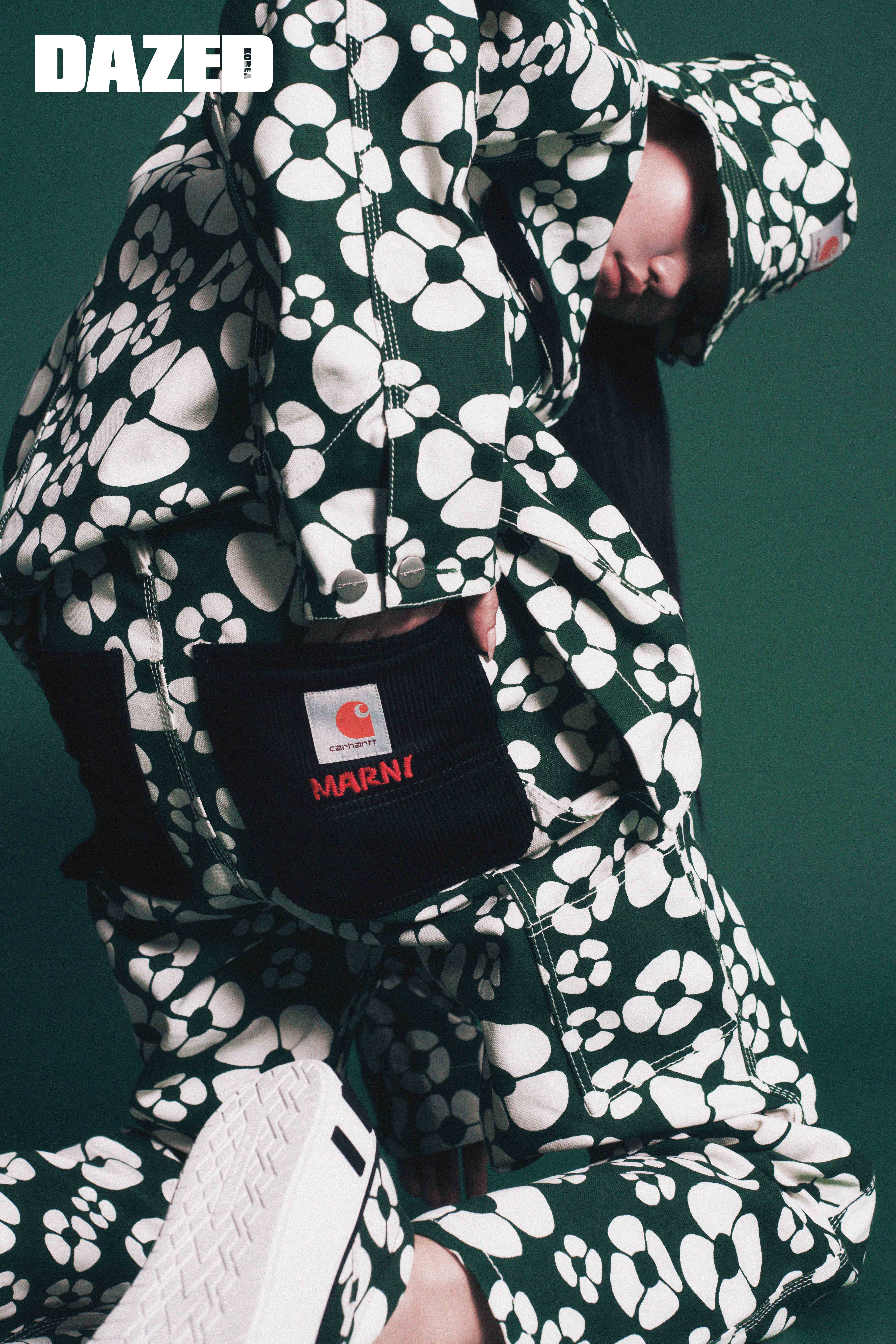 그린 마르니 플로럴 프린트와 패치 포켓 포인트의 코튼 캔버스 소재 재킷, 그린 마르니 플로럴 프린트의 유기농 코튼 캔버스 소재 트라우저, 그린 마르니 플로럴 프린트와 마르니 레터링이 돋보이는 슬립온 스니커즈, 그린 마르니 플로럴 프린트 장식의 유기농 코튼 소재 버킷 해트는 모두 마르니×칼하트 WIP(Marni×Carhartt WIP).