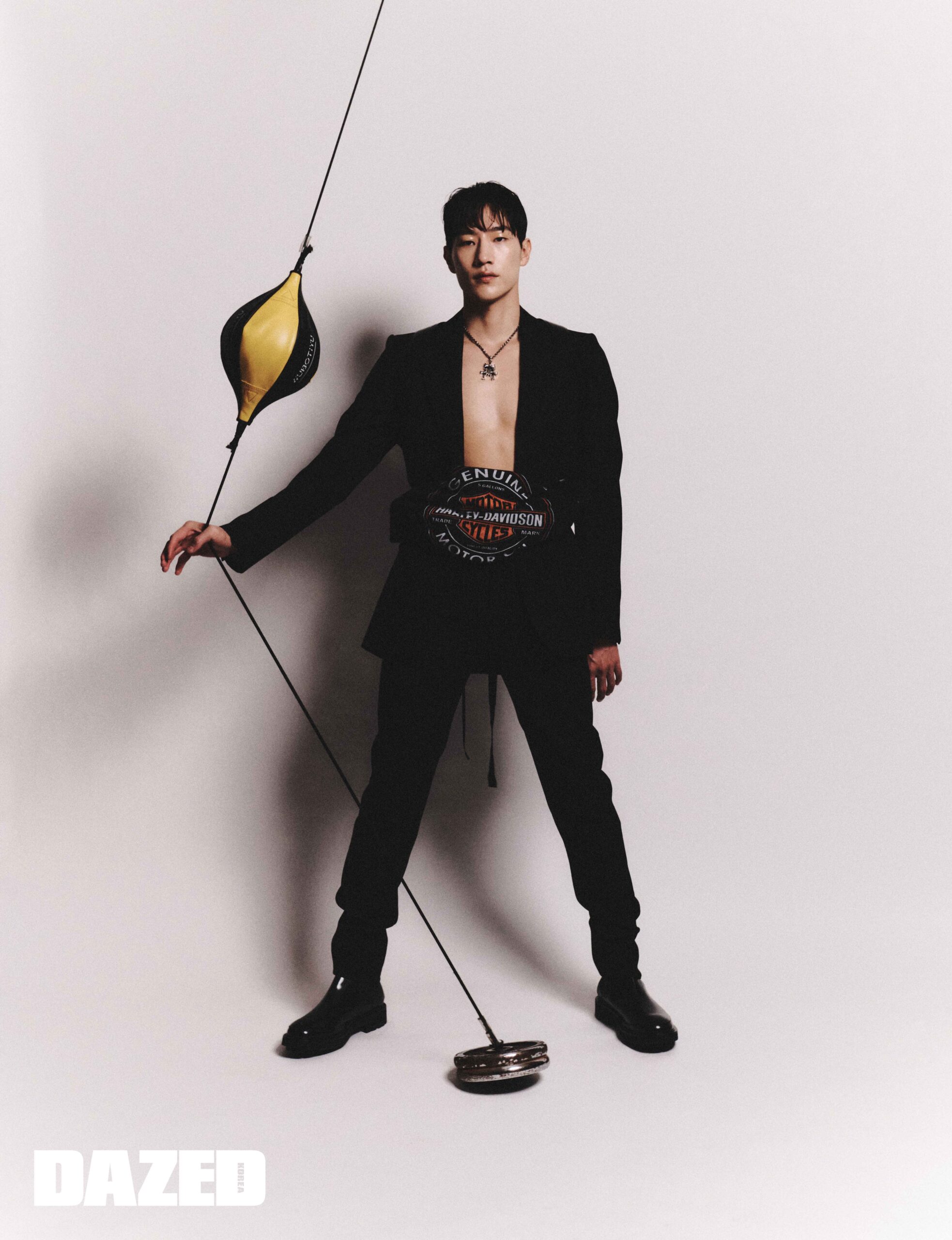 아웃 디테일의 재킷과 하네스, 팬츠, 부츠는 모두 알렉산더 맥퀸(Alexander McQueen), 네크리스는 크롬하츠(Chrome Hearts), 벨트로 연출한 티셔츠는 에디터의 것.