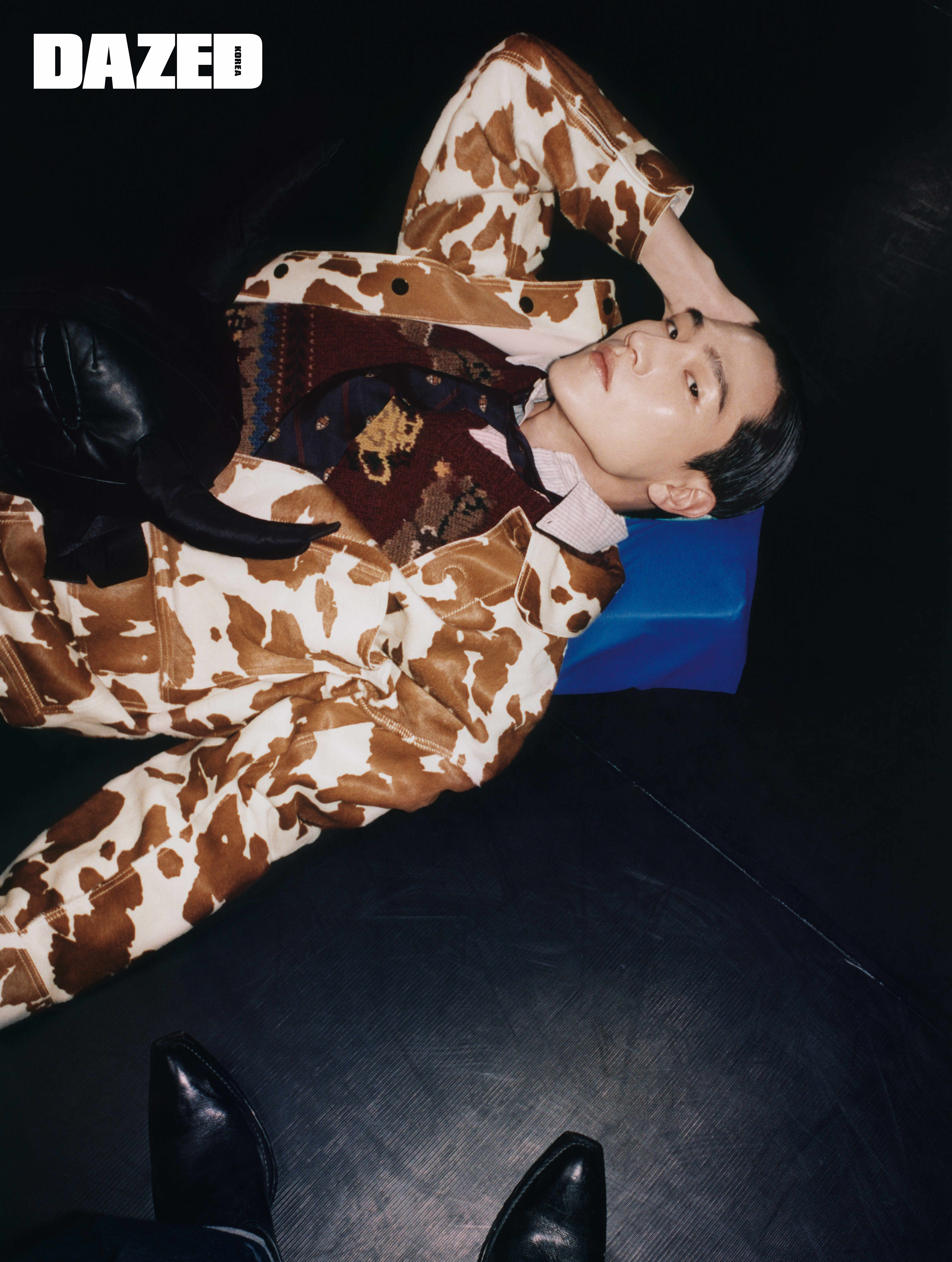 카우 패턴 재킷은 펜디(Fendi), 셔츠와 니트 톱, 타이는 모두 폴로 랄프 로렌(Polo Ralph Lauren), 뿔이 달린 마스크는 김신류(Kimsinryu).