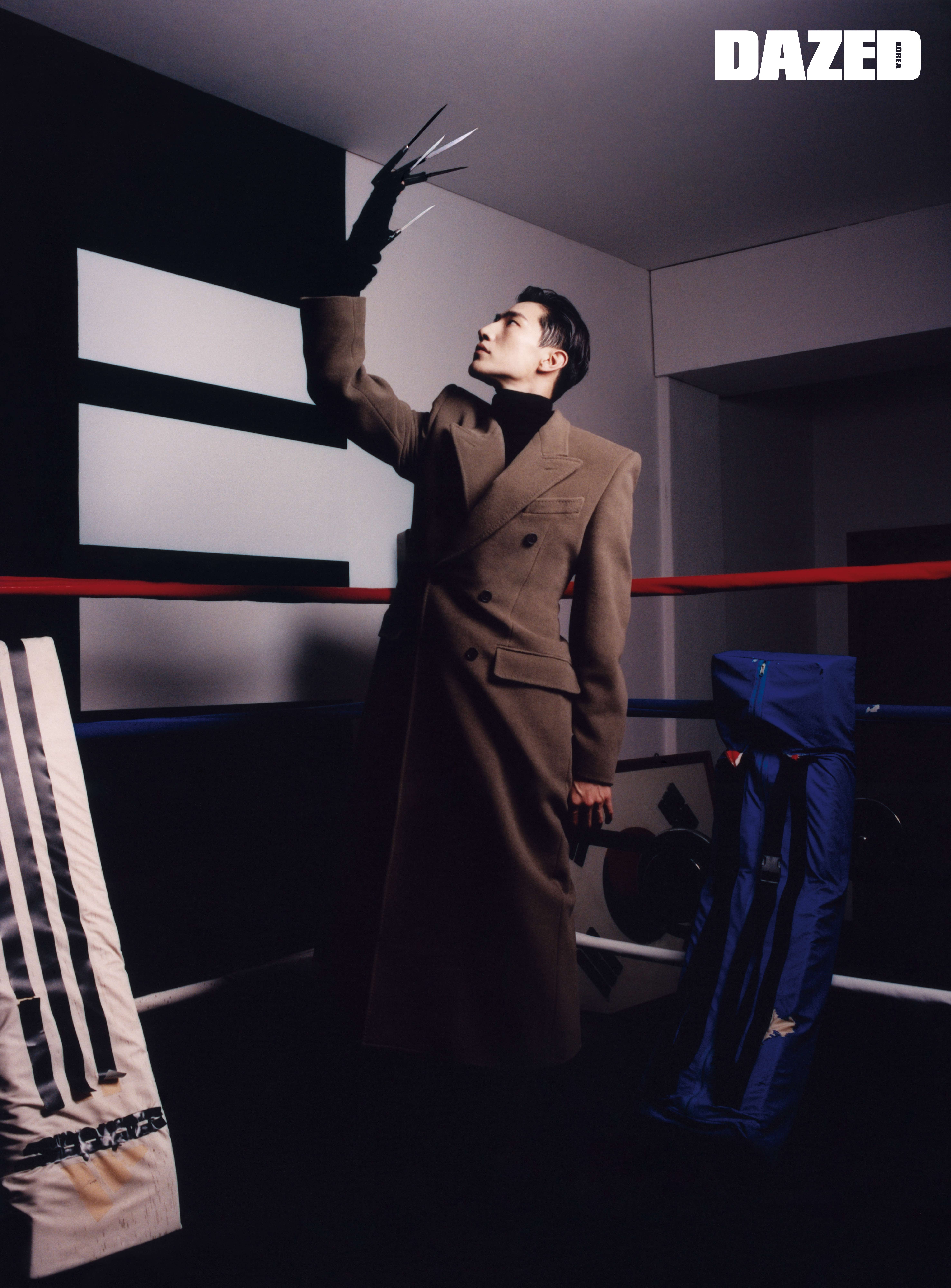 더블브레스트 코트와 터틀넥 톱, 데님 팬츠는 모두 발렌시아가(Balenciaga), 나이프 글러브는 에디터의 것.