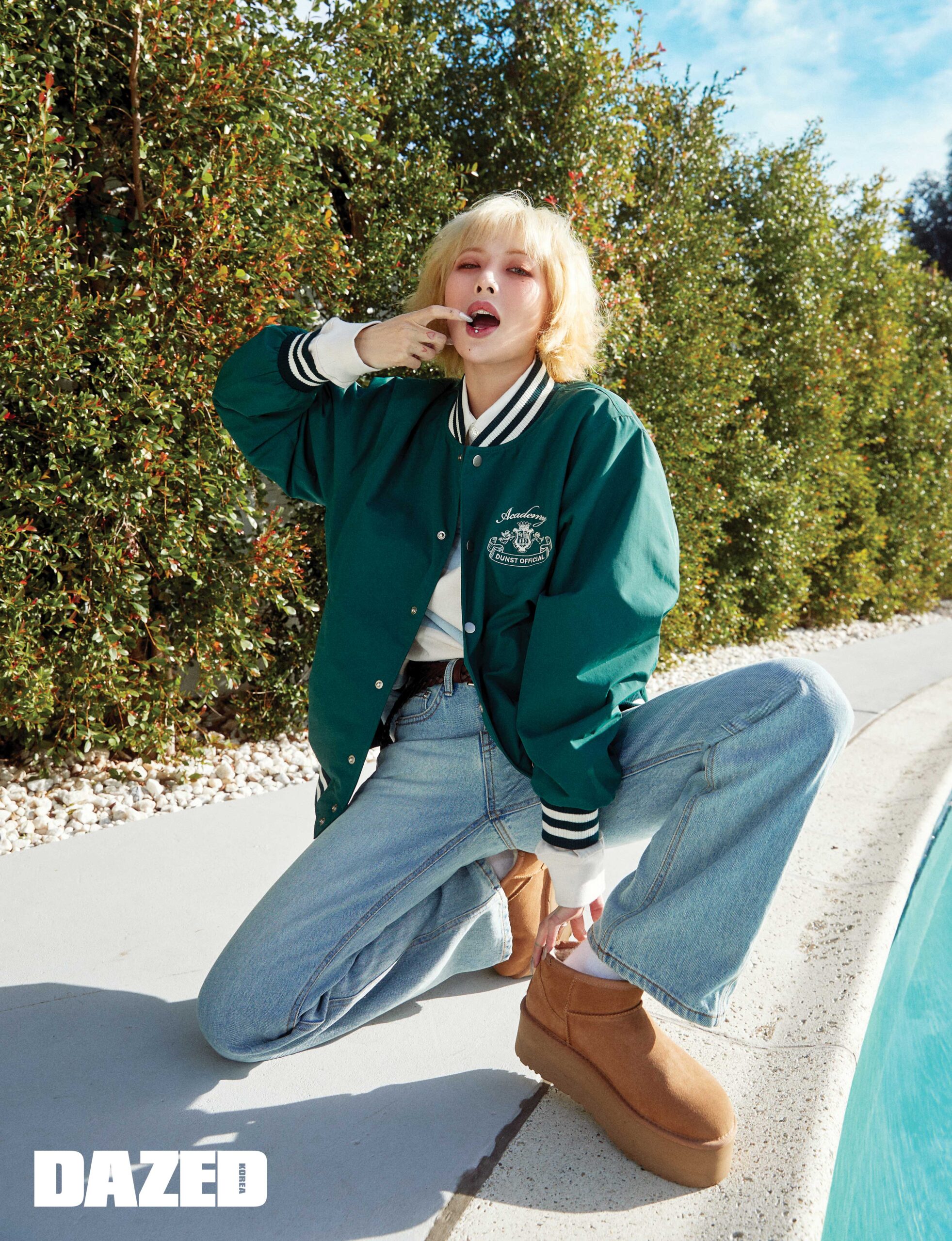 보이시한 무드의 스타디움 재킷과 스웨트셔츠, 라이트 블루 컬러 데님 팬츠, 위빙 패턴 벨트는 모두 던스트(Dunst), 마이크로 쇼트 부츠는 어그(Ugg).
