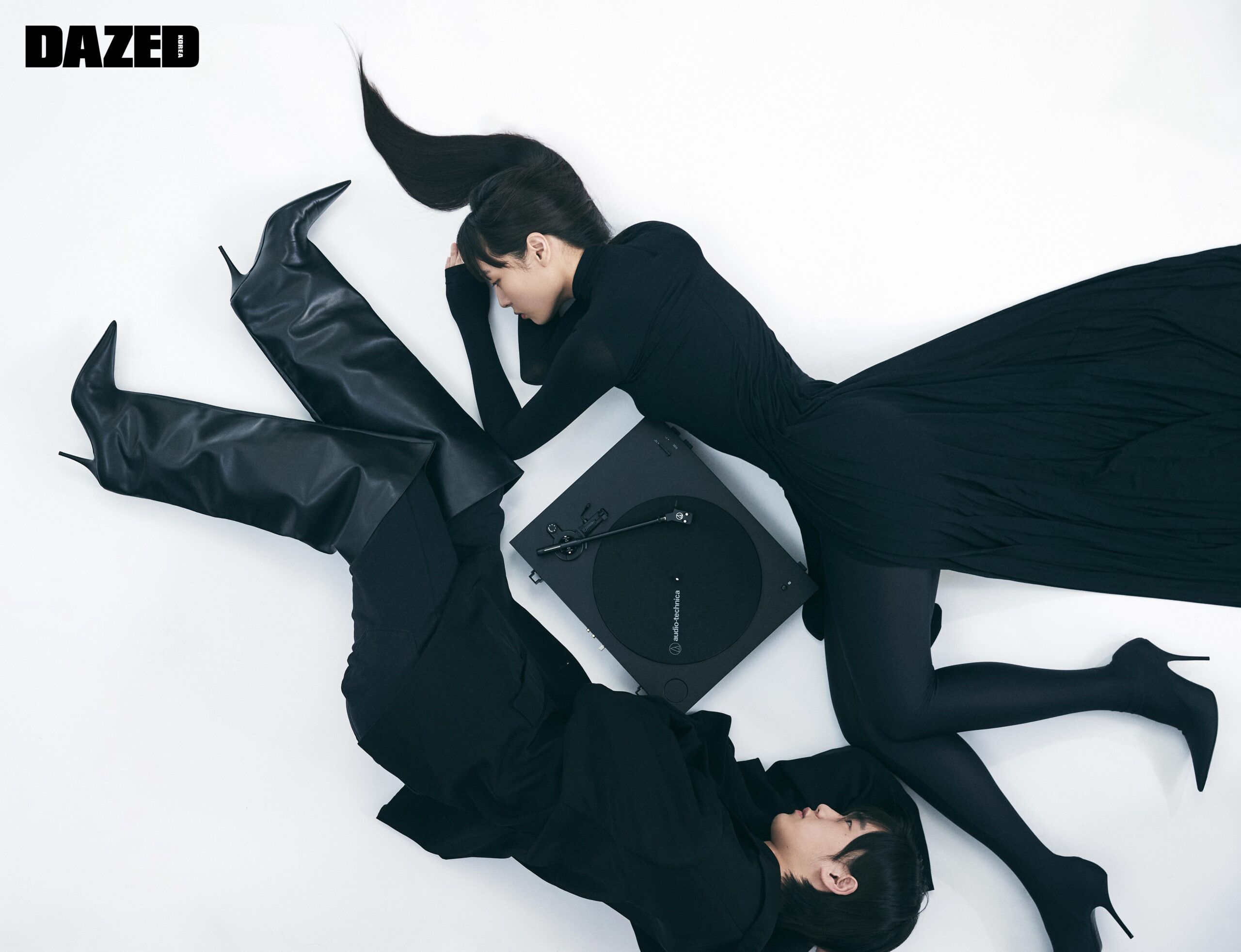 윤수가 입은 오버사이즈 블랙 재킷과 팬츠 그리고 블랙 롱부츠, 주현이 입은 블랙 드레스와 오버더니 부츠는 모두 발렌시아가(Balenciaga).