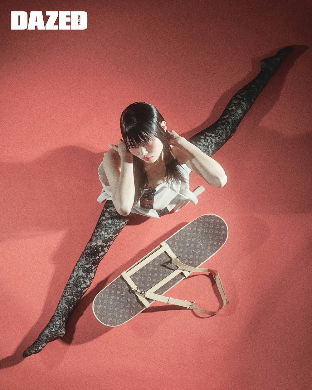 지퍼 디테일 드레스, 패턴 타이츠, 스케이트보드와 스트랩은 모두 루이 비통(Louis Vuitton).