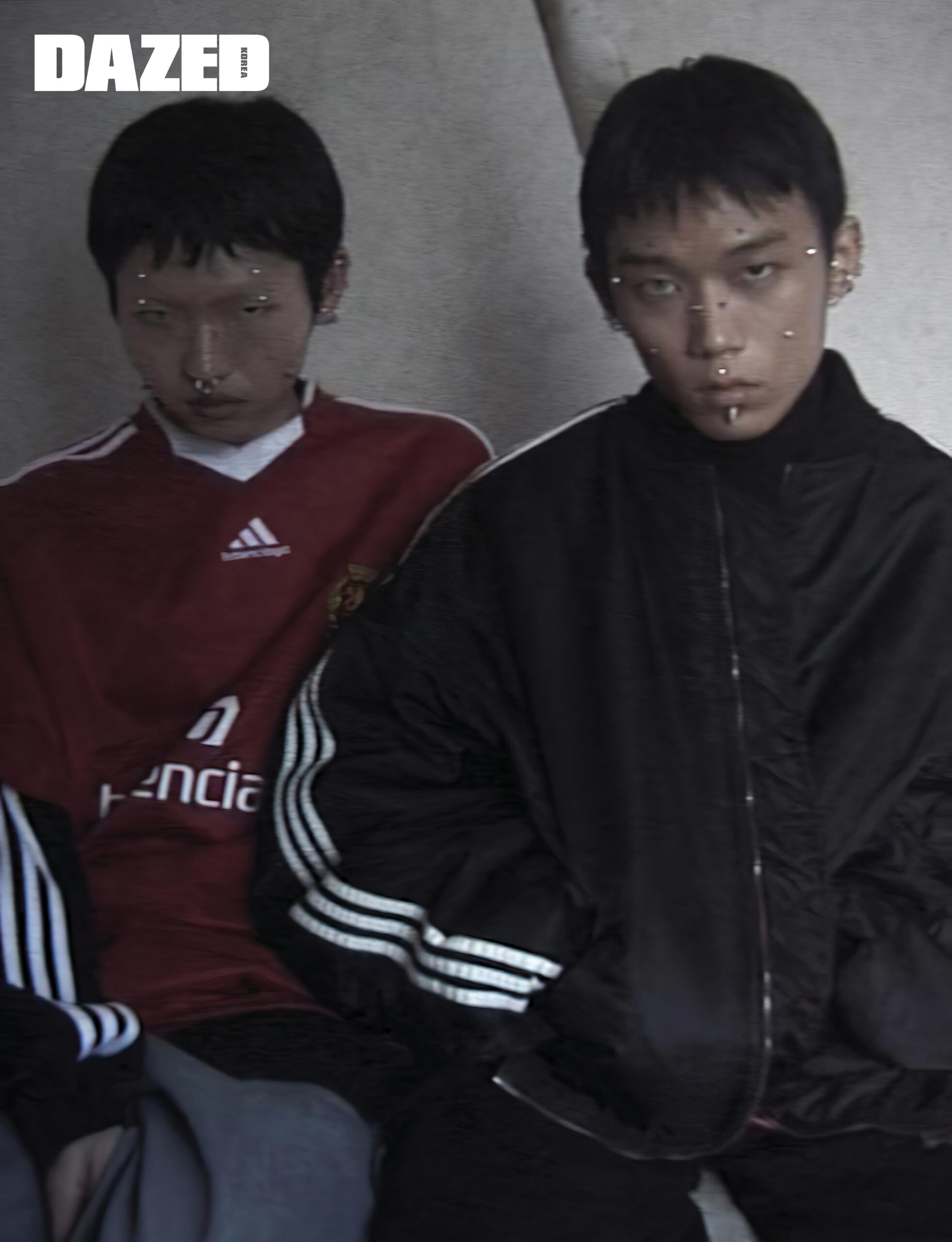 건영이 입은 저지 티셔츠와 데님 팬츠는 발렌시아가(Balenciaga). 주영이 입은 재킷과 블랙 톱, 팬츠는 모두 발렌시아가(Balenciaga).
