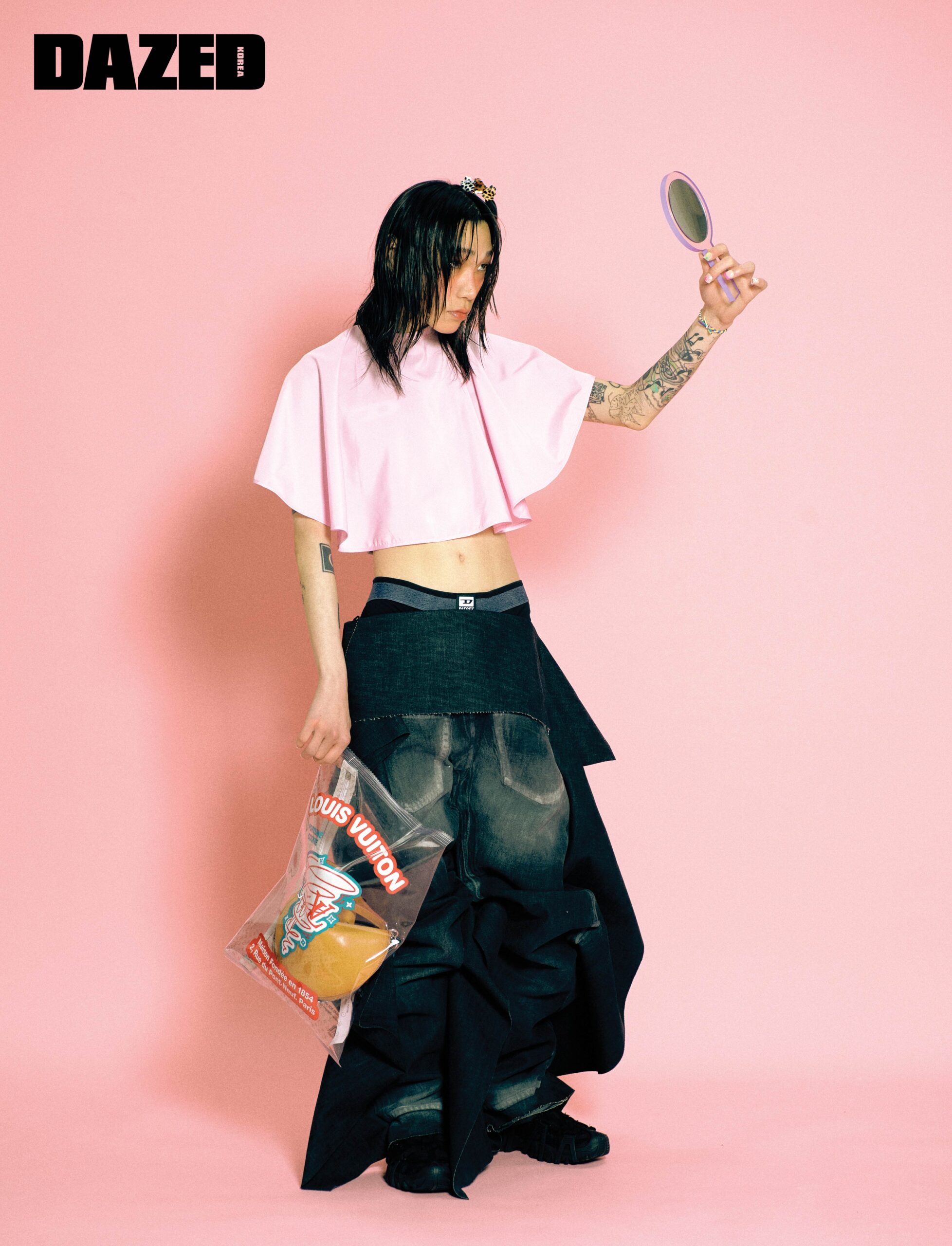 오버사이즈 팬츠와 스니커즈는 디젤(Diesel), 포춘 쿠키 모티브 백은 루이 비통(Louis Vuitton), 레오퍼드 패턴의 미니 집게 헤어핀은 모두 프루타(Fruta), 데님 브리프는 에디터의 것.